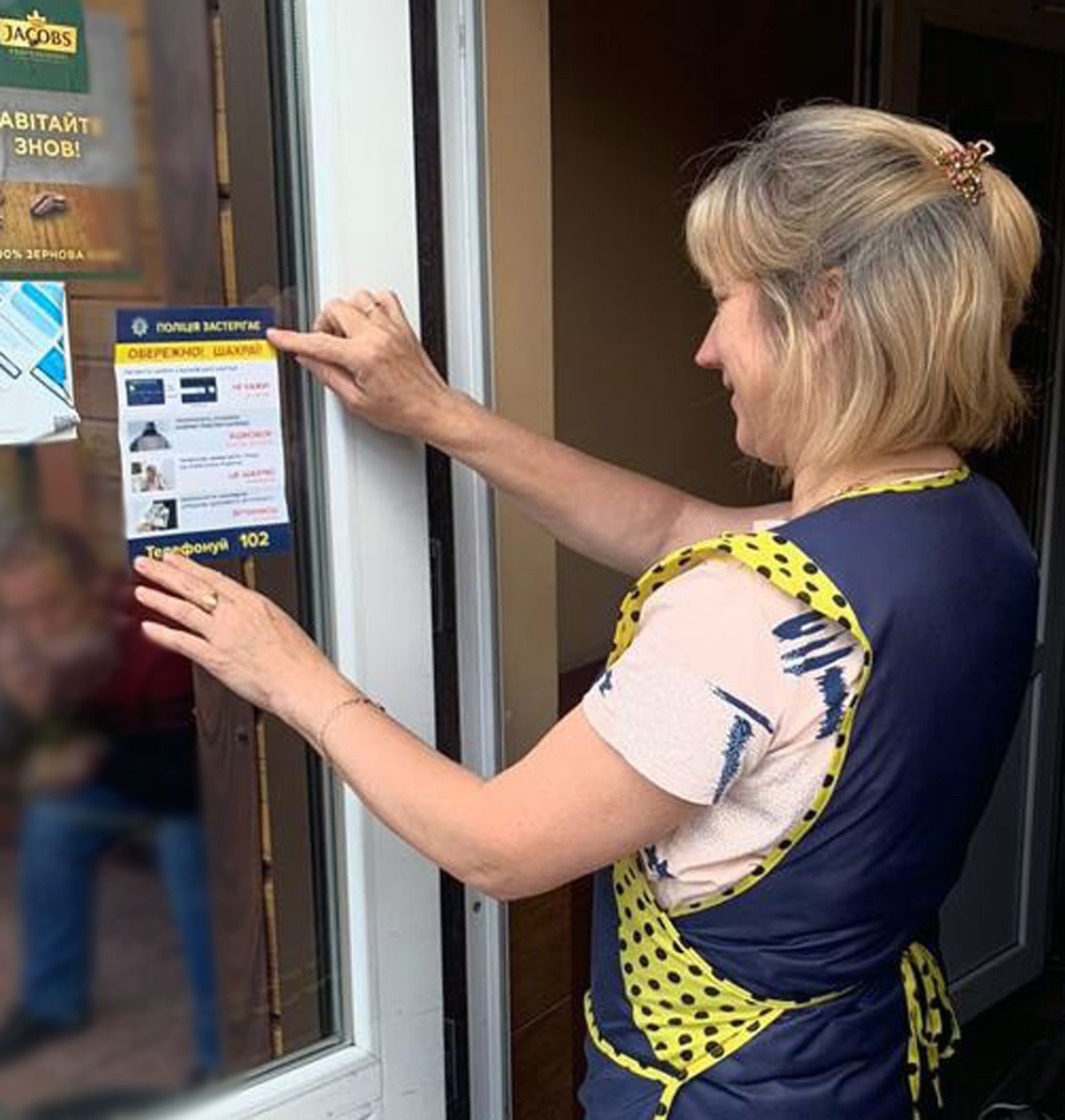 Поліція проводить профілактичні відпрацювання для інформування громадян про шахрайські схеми. На ринках, зупинках громадського транспорту та в інших місцях скупчення людей поліцейські розповсюджують інформаційні листівки. Кожна така листівка містить опис найбільш «популярних» шахрайських прийомів, рекомендації поліції як діяти в тій чи іншій ситуації.