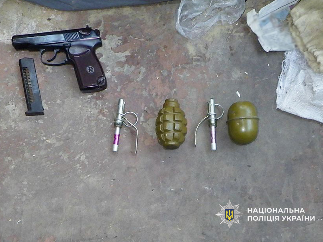 У ході обшуку поліцейські виявили та вилучили предмети, схожі на ручні гранати із запалами до них, набої та пістолет ззовні схожий на травматичний.