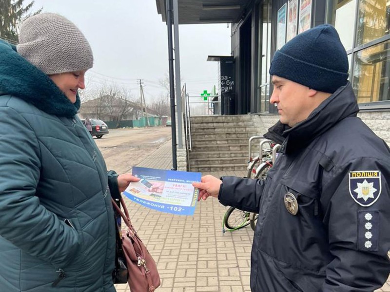 На Чернігівщині поліція проводить профілактичне відпрацювання для інформування громадян про шахрайські схеми. Поліцейські розповсюджують серед населення інформаційні листівки, аби убезпечити громадян від найпоширеніших видів шахрайства. Кожна така листівка містить опис найбільш «популярних» шахрайських прийомів, рекомендації поліції як діяти в тій чи іншій ситуації.