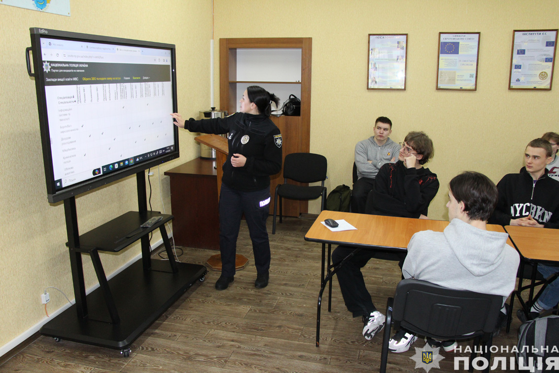 Правоохоронці розповіли майбутнім абітурієнтам про основні функції та завдання, які покладені на співробітників поліції, а також про умови вступу та специфіку навчання у навчальних закладах вищої освіти зі специфічними умовами навчання, які здійснюють підготовку поліцейських. Ознайомили учнів зі спеціальностями, за якими готують молодих фахівців, переваги професії поліцейського та можливості подальшого працевлаштування в органах Національної поліції України.
