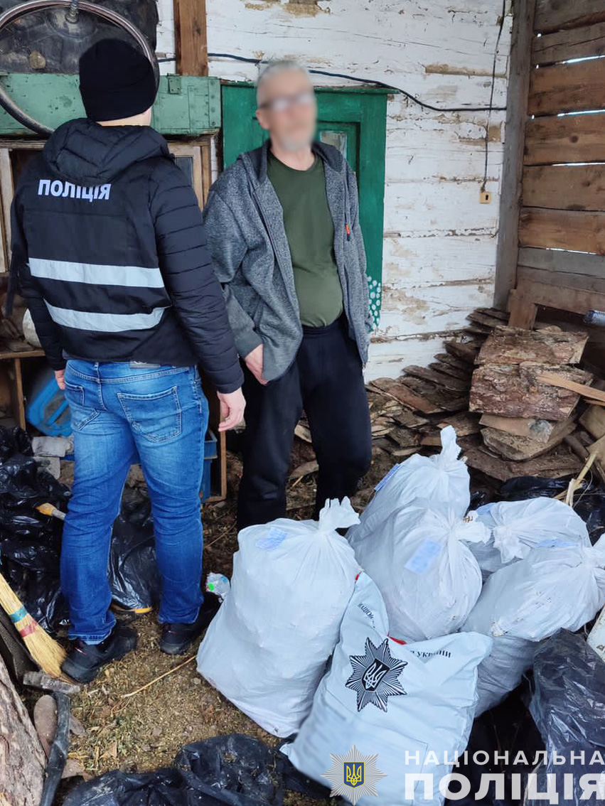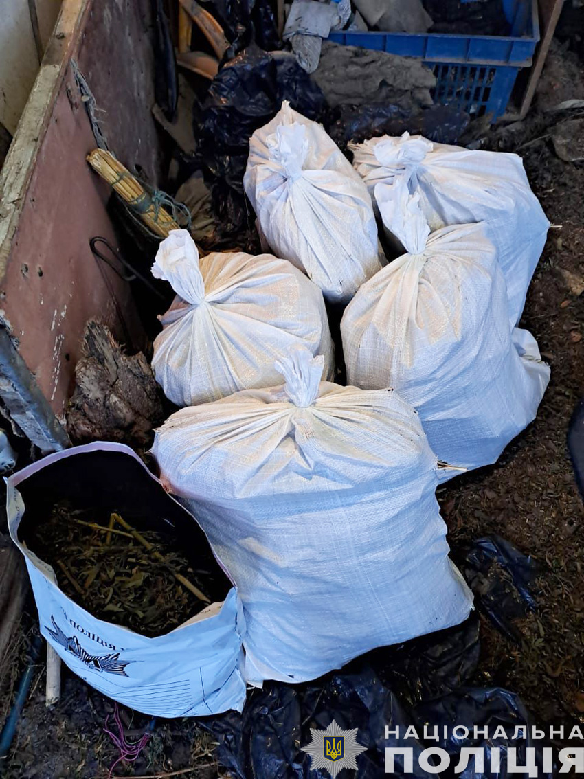 В ході слідчої дії поліцейські виявили на горищі будинку та в господарській споруді близько 5 кілограмів рослин, що схожі на коноплі, насіння конопель загальною вагою близько 400 грамів, 2 ємності з подрібненою рослинною речовиною. Також вилучено саморобний прилад для куріння та сито з нашаруванням наркотичної речовини.