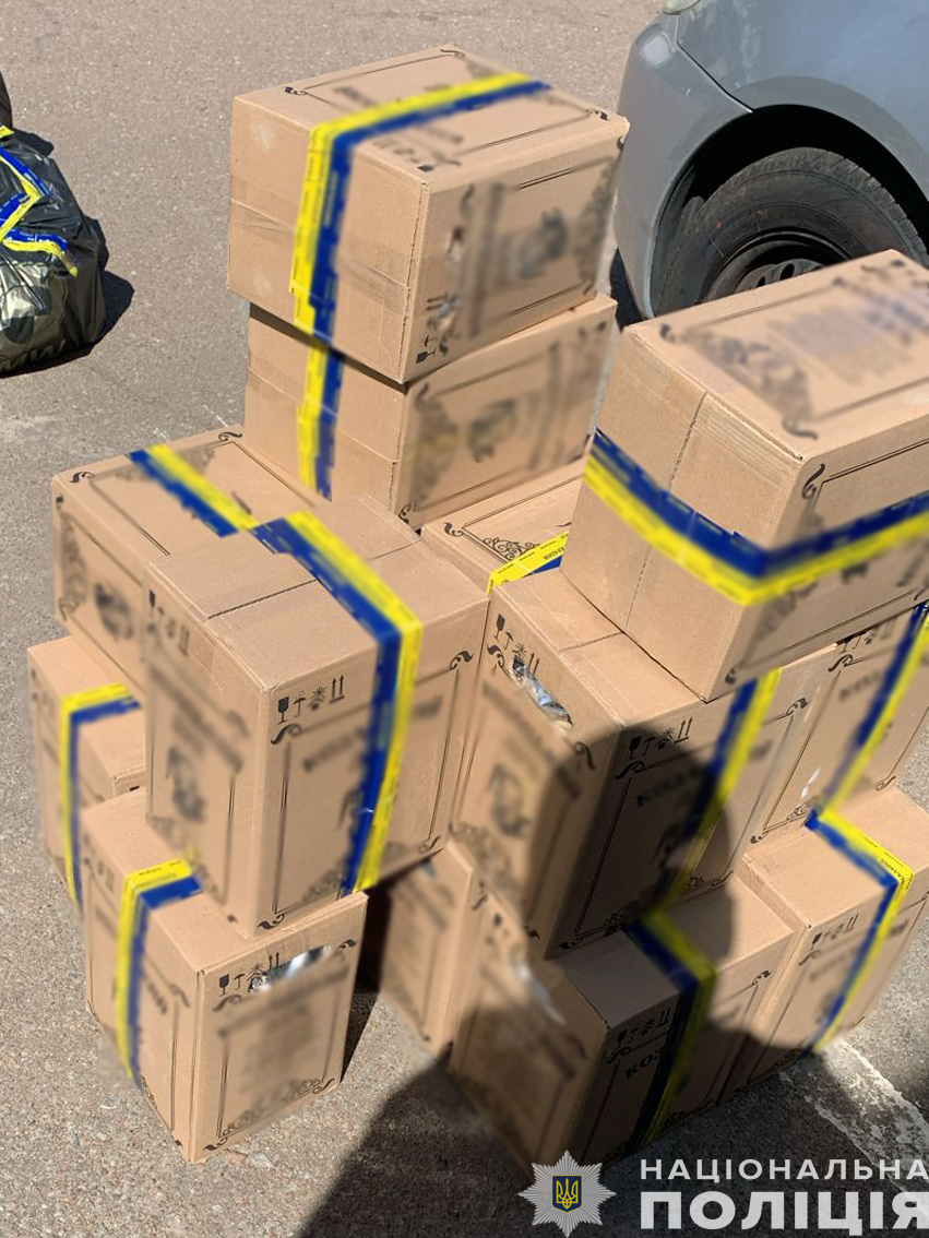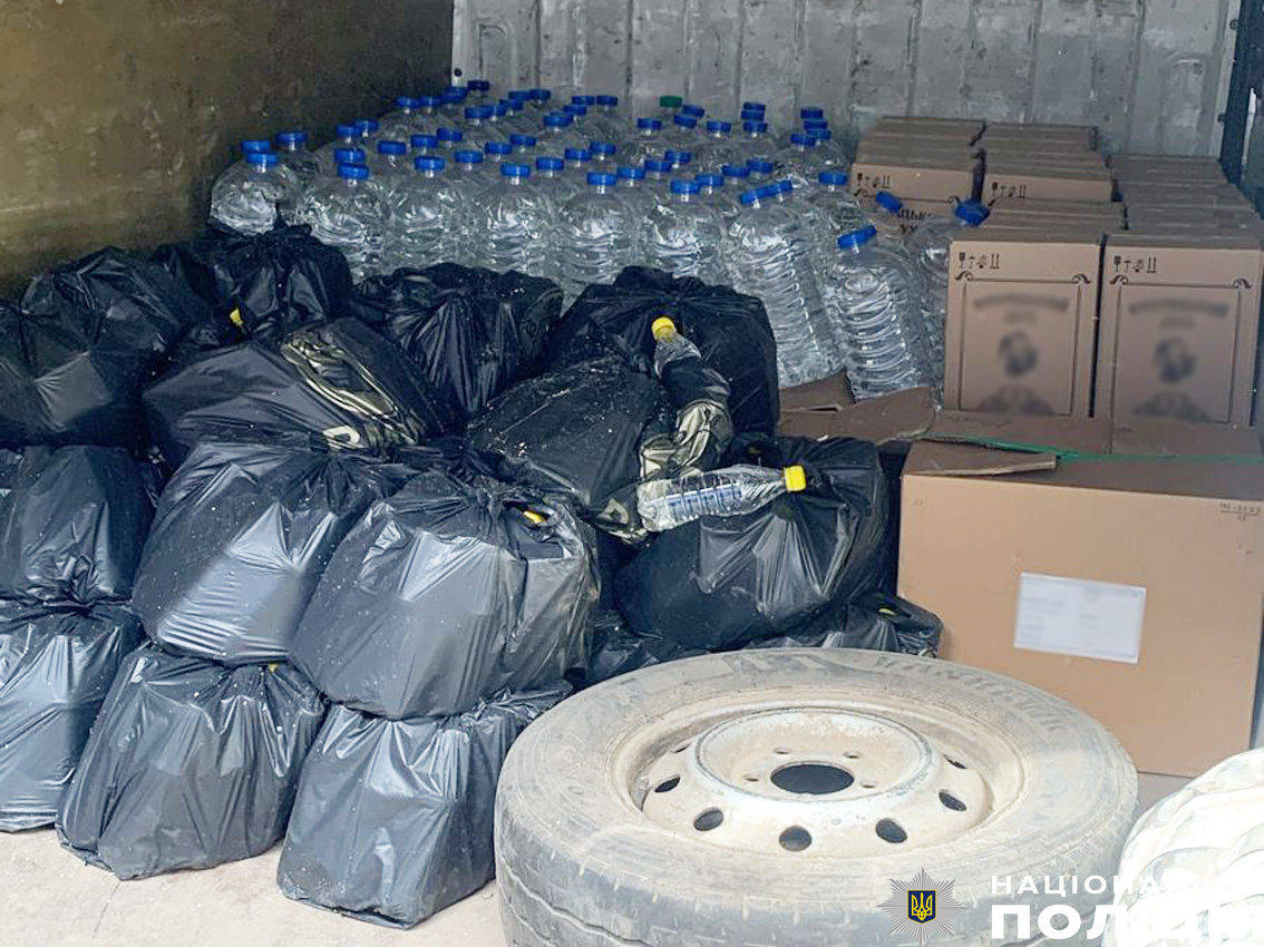 Поліцейські виявили в салоні транспортного засобу близько 200 ємностей об’ємом по 5 л кожна, 400 пляшок об’ємом 0,5 л з рідиною схожою на спирт, а також 30 картонних коробок в кожній з яких знаходився пакет ємністю 10 л з алкоголем невідомого походження.