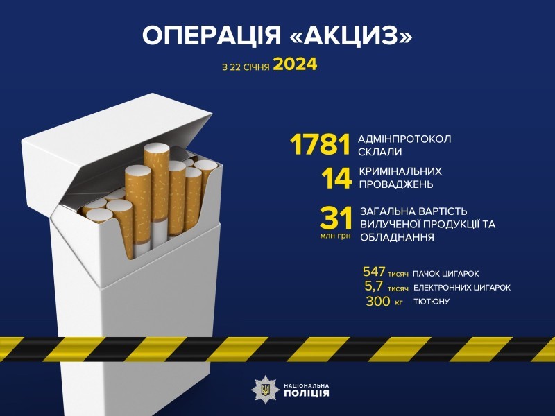 Окрім того, відкрито 14 кримінальних проваджень. Загалом, упродовж тижня співробітники ДСР та слідчих підрозділів поліції у співпраці з колегами-правоохоронцями вилучили з незаконного обігу 547 000 пачок цигарок, 5 700 електронних цигарок та рідин до них, понад 300 кг тютюну та спецобладнання. Загальна сума вилученого сягає 31 000 000 гривень.