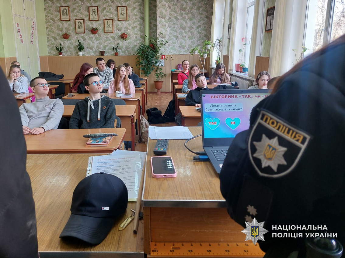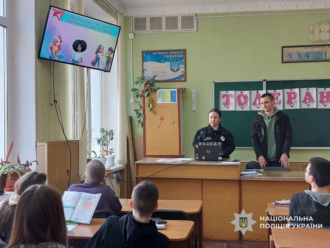 Поліцейська Валерія Пироцька разом із ветераном російсько-української війни Василем Крючковим, який нині працює помічником начальника Прилуцького районного відділу поліції з питань ветеранської політики, провели для учнів Прилуцької гімназії №12 патріотично-виховний урок. Діти дізналися про важливість толерантності, повагу до людей з інвалідністю та підтримку у суспільстві.