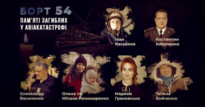 Увесь екіпаж вертольота: Олександр Василенко, Костянтин Коваленко, Іван Касьянов. Авіакатастрофа також забрала життя 4 жительок Броварів: Олена та Мілана Пономаренко, Марина Грановська, Тетяна Бойченко.