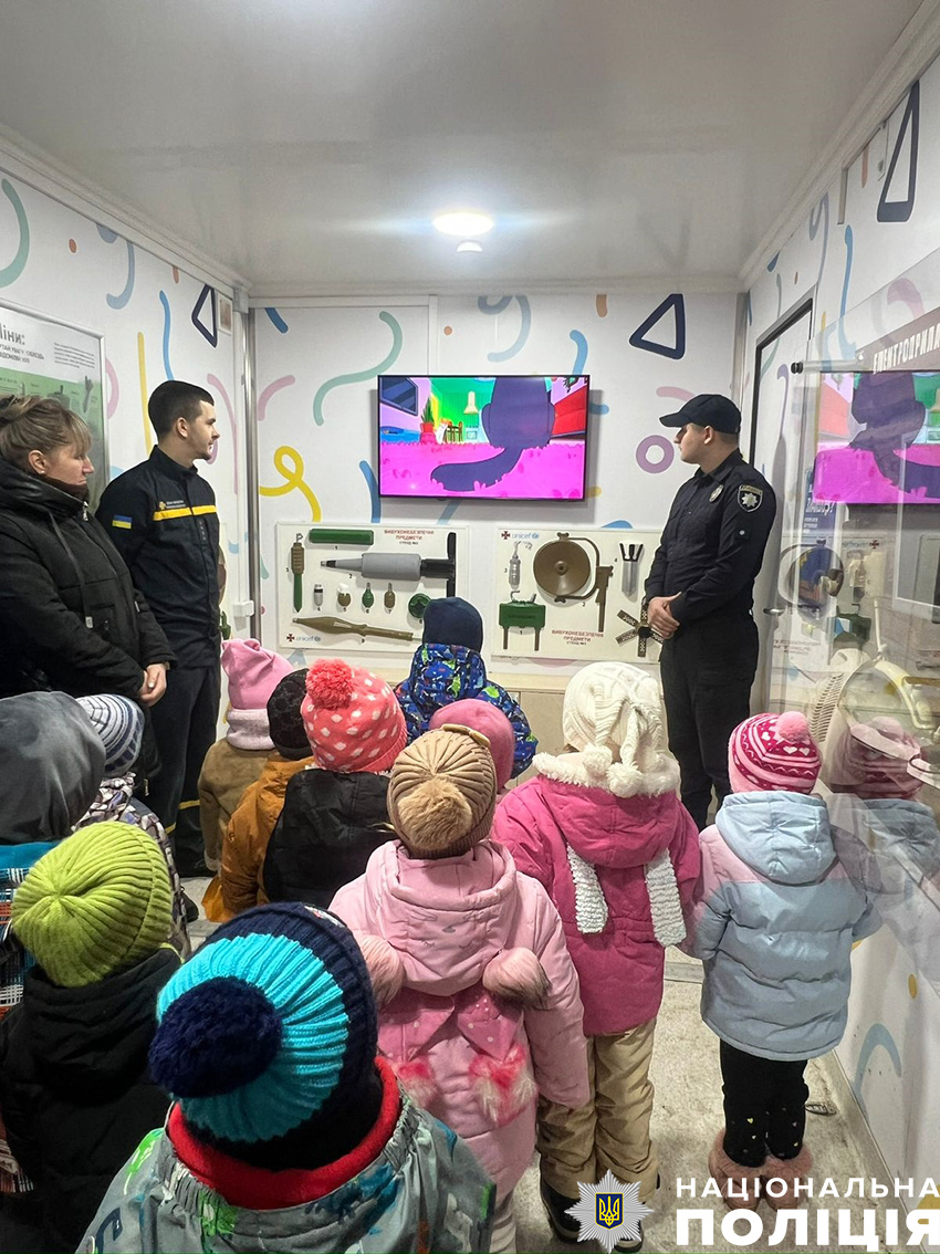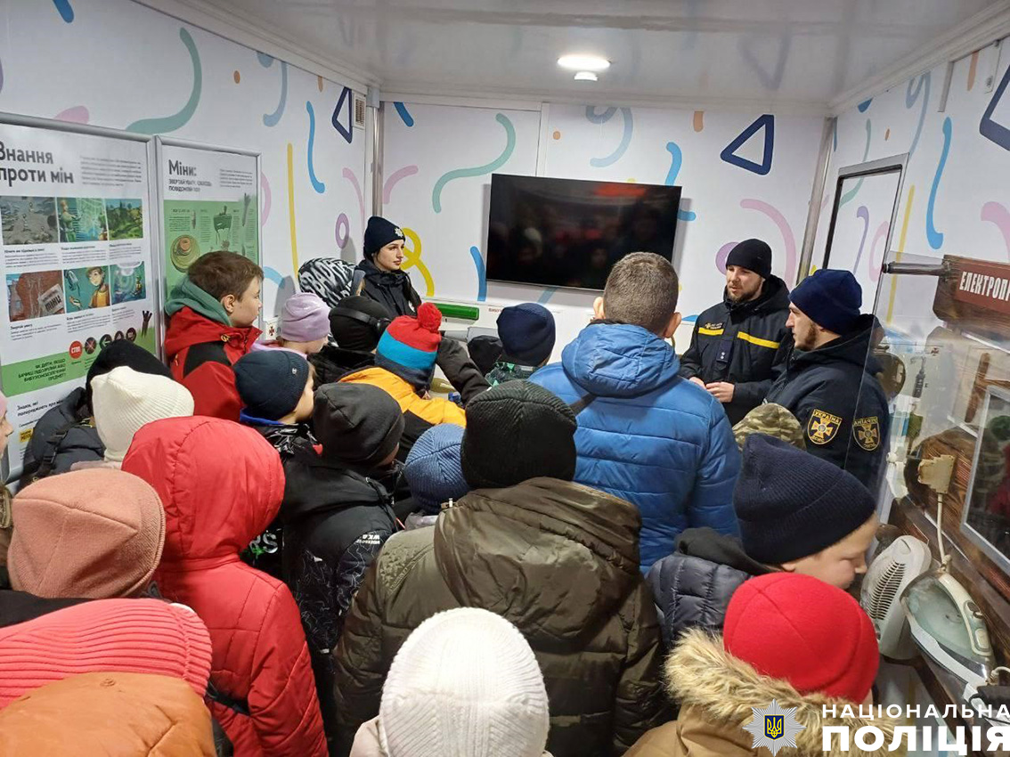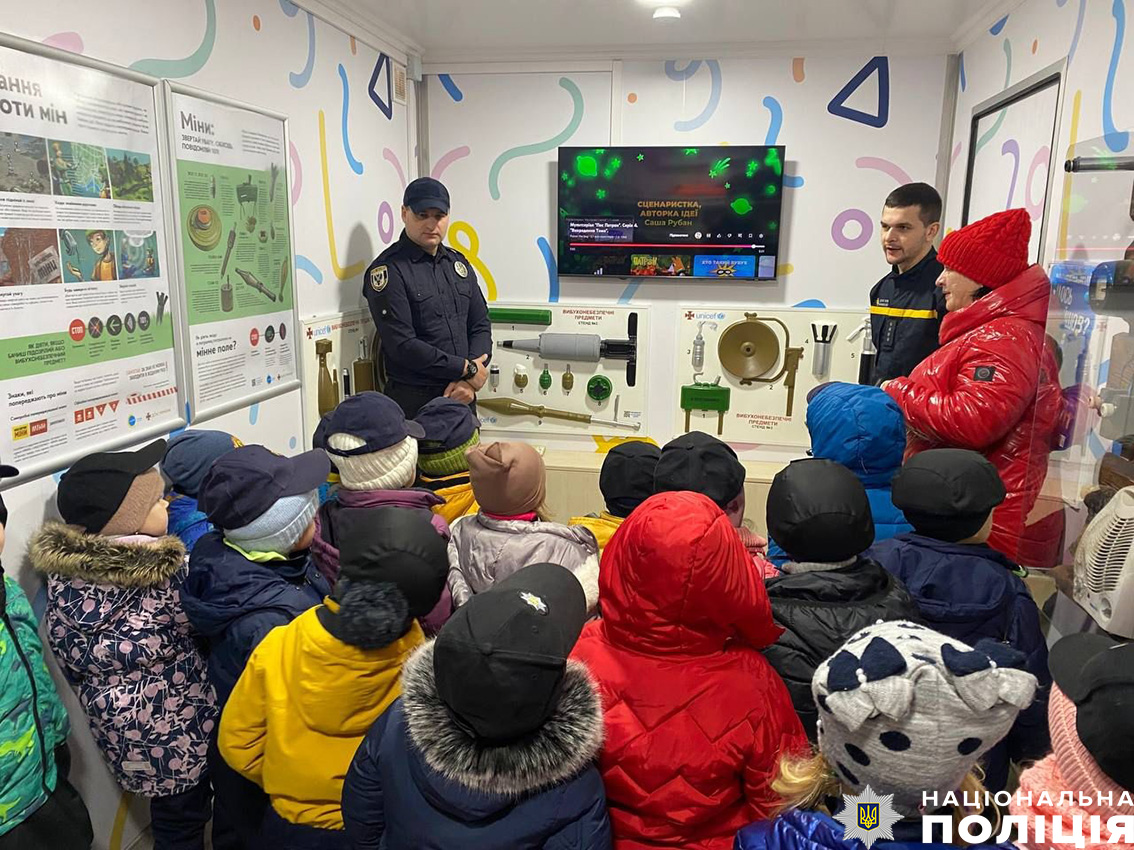 За допомогою спеціально обладнаного транспортного засобу дітям розповіли правила безпечної поведінки в умовах війни, а саме про: