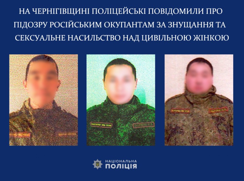 Слідчі поліції Чернігівщини під процесуальним керівництвом Чернігівської обласної прокуратури оголосили трьом військовим окупаційної армії рф про підозри у порушенні законів та звичаїв війни через встановлені факти жорстокого поводження з мирною громадянкою України та вчинення сексуального насильства над нею.