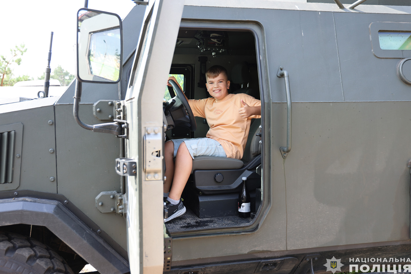 Іменинник залюбки приміряв на себе комплект захисного спорядження, наданий батьковими колегами. Також хлопчик з великою цікавістю оглянув ззовні та посидів усередині бронетехніки, що є на озброєнні підрозділу. Ясна річ, не обійшлося свято і без вручення приємних подарунків та смаколиків.