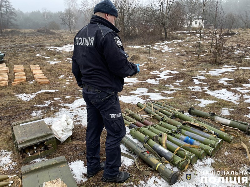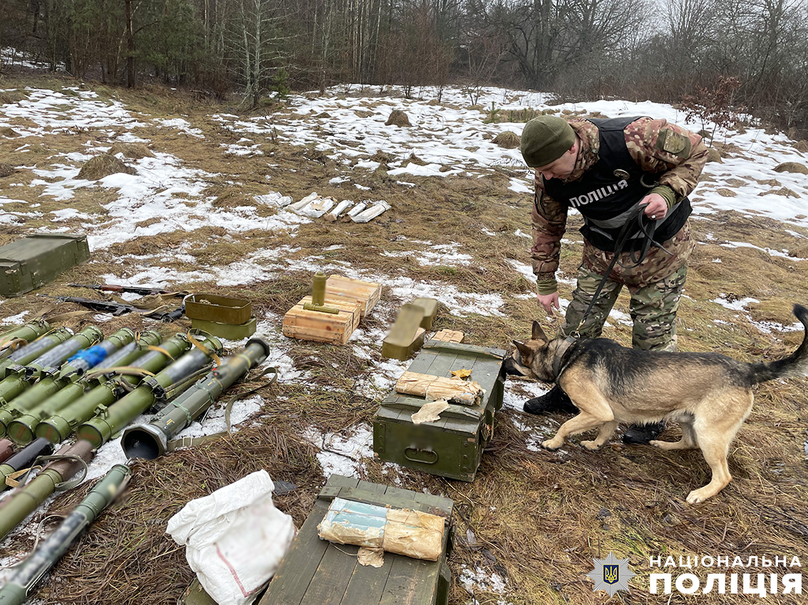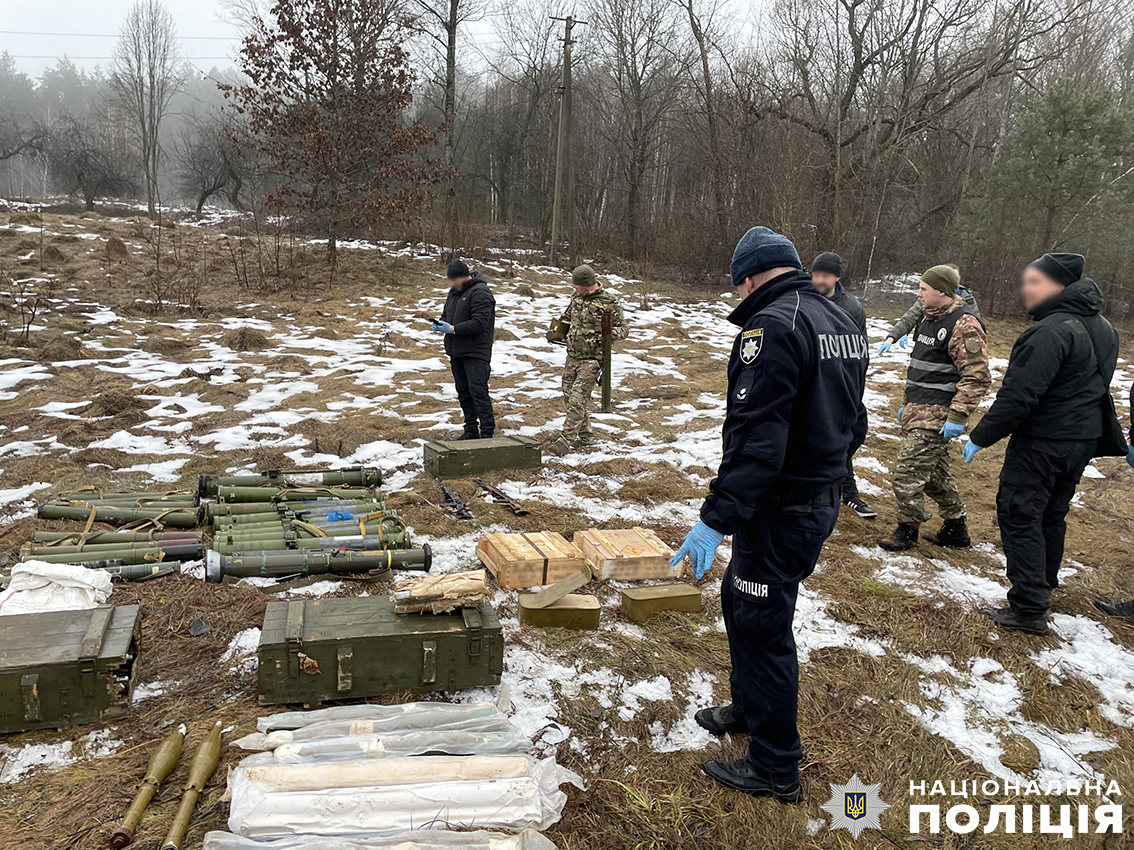 Оперативники із залученням поліцейських вибухотехніків, кінолога зі службовим собакою виявили у нежитловій будівлі та поблизу неї численну кількість зброї та боєприпасів: 16 гранатометів, 31 постріл до ручного гранатомета, два автомати, ручний вогнемет, 26 ящиків набоїв калібру 7,62 мм до автоматичної стрілецької зброї (загалом понад 37 тисяч набоїв), понад 50 ручних гранат різних типів, майже півтори сотні боєприпасів до підствольних гранатометів.