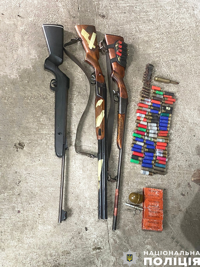 В ході санкціонованого обшуку слідчі Головного управління Нацполіції спільно з поліцейськими Управління стратегічних розслідувань в Чернігівській області виявили та вилучили одну нарізну та дві гладкоствольні рушниці з набоями до неї, корпус ручної гранати із запалом, 4 тротилові шашки, а також набої.