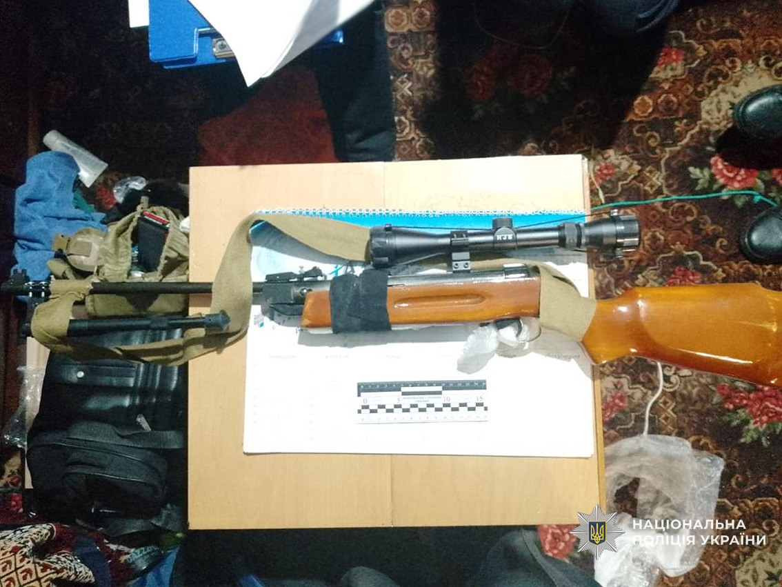 Поліцейські провели невідкладний обшук у помешканні нападника. У ході слідчої дії правоохоронці виявили та вилучили: 5 корпусів гранат різних марок, запали УЗРГМ-2, 2 підривника різних марок, пластичну вибухову речовину, 11 пістолетів різних марок, 2 саморобні пристрої для відстрілу патронів, 4 магазини з набоями, близько 1000 набоїв різного калібру, запчастини до вогнепальної зброї, інші речові докази. Усе вилучене направлено на проведення експертних досліджень.