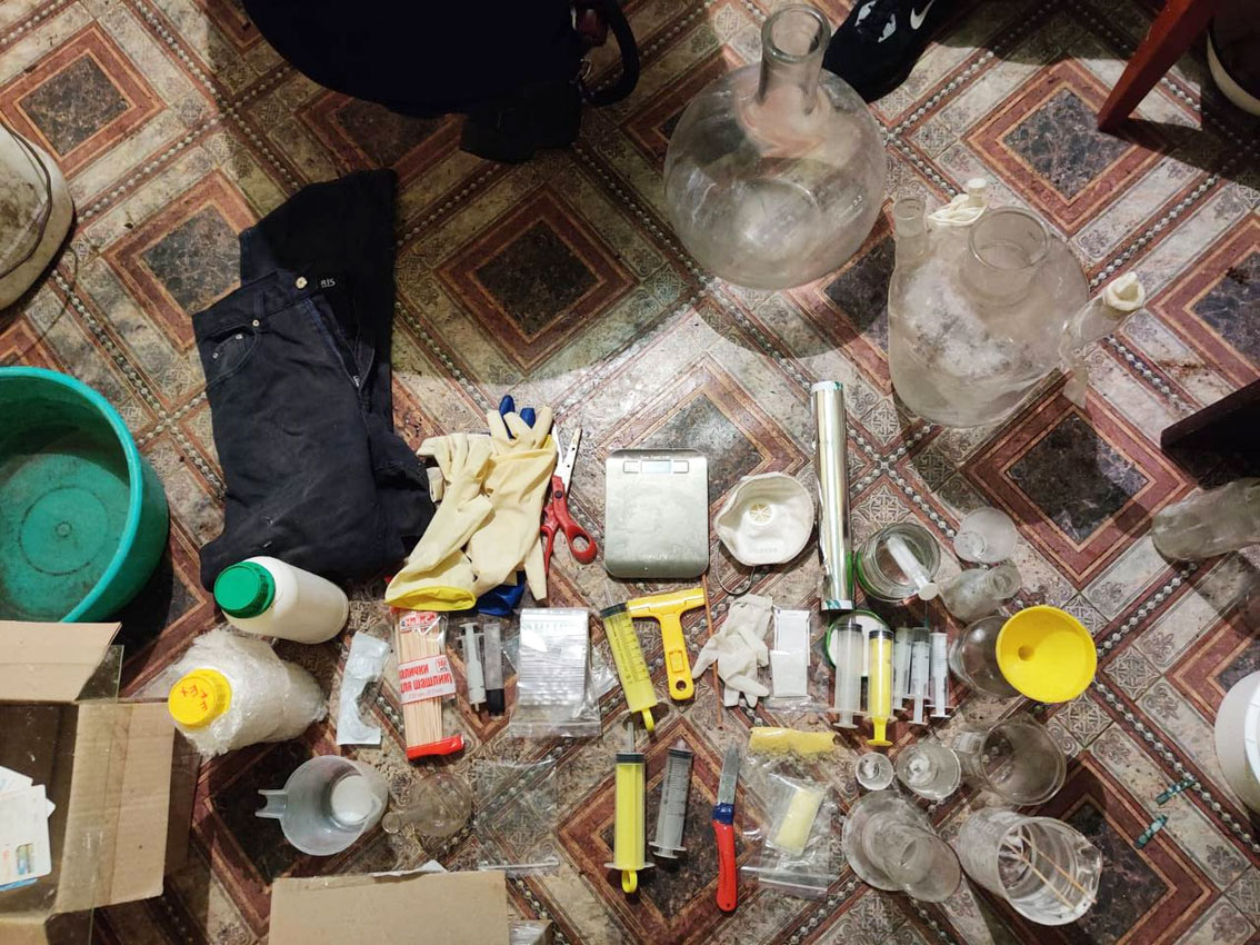 Під час слідчих дій поліцейські становили, що нарколабораторія була облаштована у приватному будинку одного із сіл району подалі від людських очей, в якій відбувалося виготовлення особливо небезпечної психотропної речовини «амфетамін». У вказаному будинку під час обшуку виявили велику кількість різноманітного обладнання для виготовлення психотропних речовин, раніше вироблену незаконну "продукцію" та інгредієнти для нових партій.