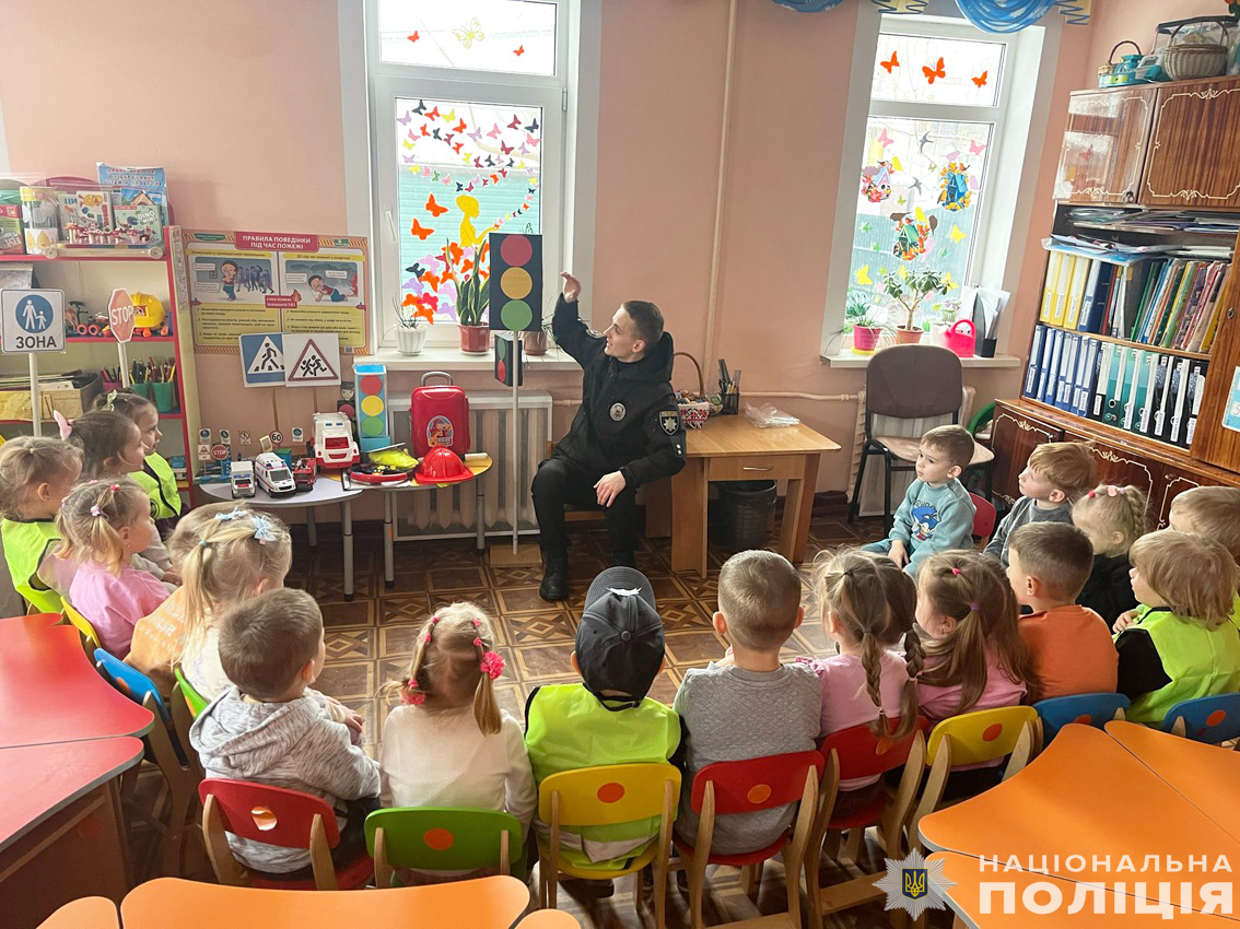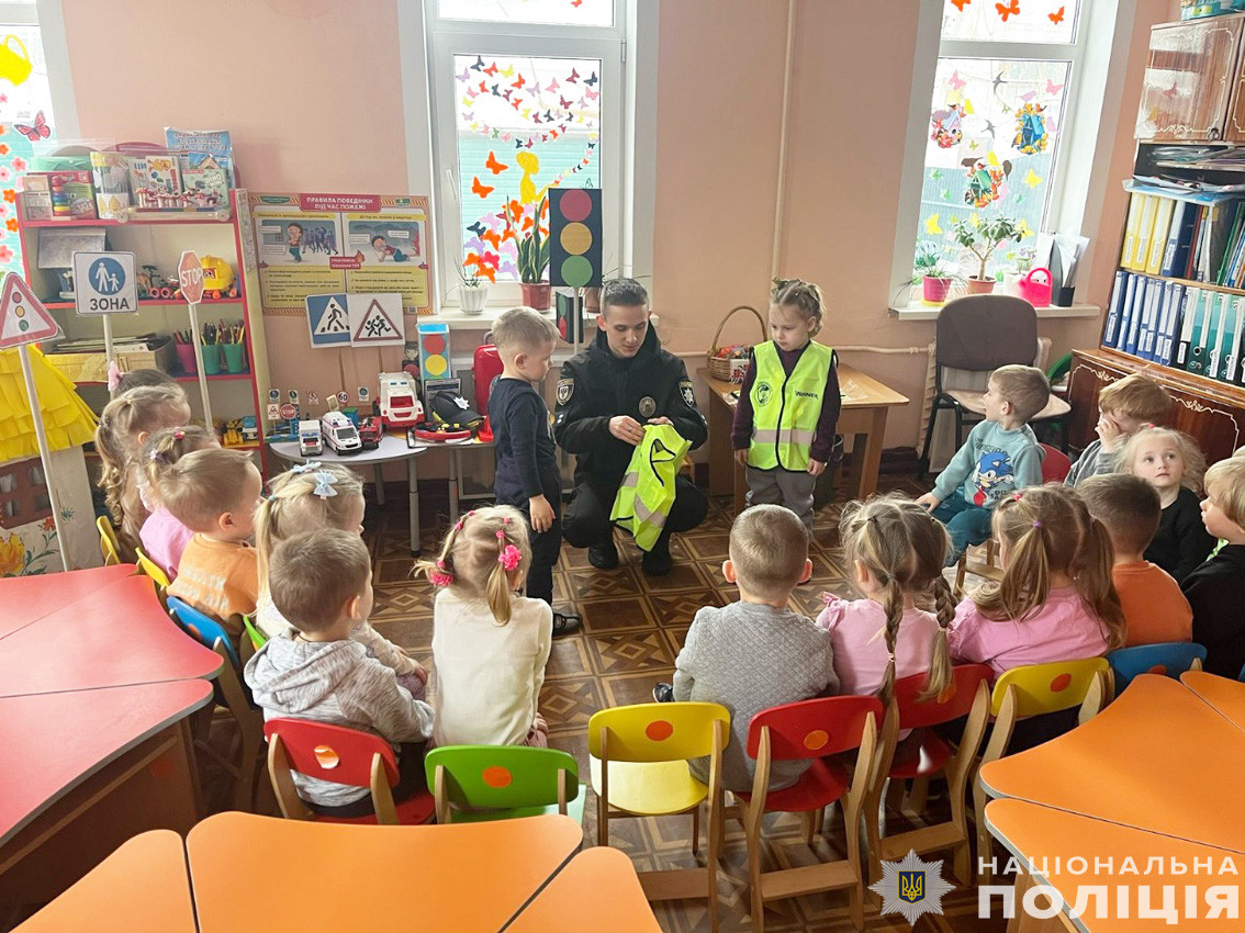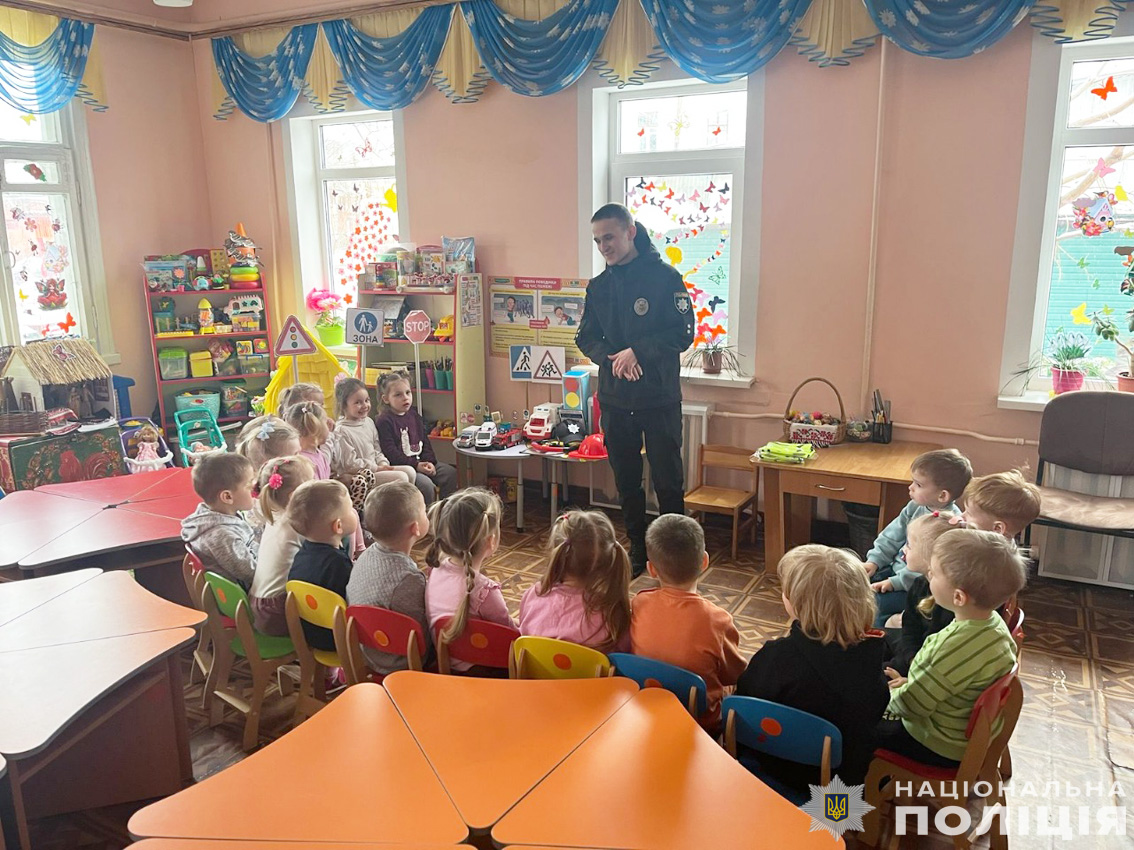 Ювенальні поліцейські нагадали дошкільнятам про важливість дотримання правил дорожнього руху, розповіли про безпечну поведінку у громадських місцях, а також нагадали про виконання алгоритму дій під час отримання сигналу «Повітряна тривога».