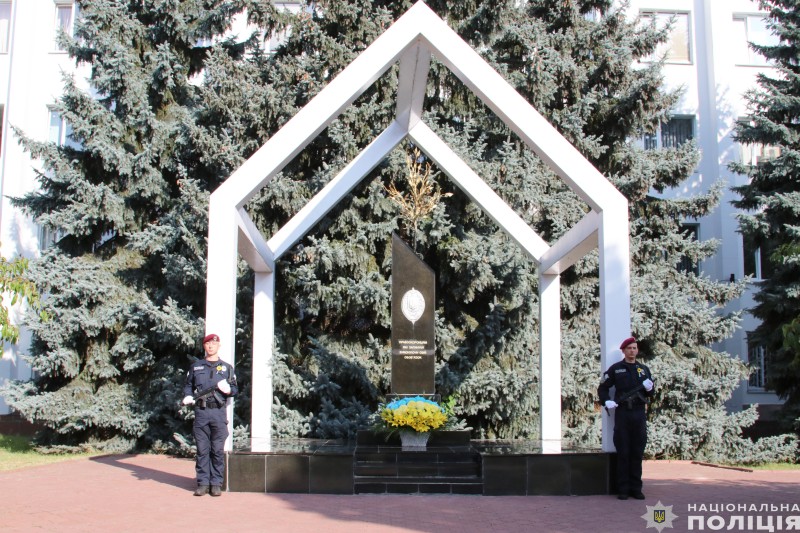 Поліцейські разом з членами сімей загиблих побратимів поклали квіти до Меморіалу співробітникам органів внутрішніх справ, загиблим під час виконання службових обов’язків, після чого встановили символічні прапорці з іменами полеглих Героїв біля меморіальної стели загиблим воїнам на Красній площі в Чернігові.