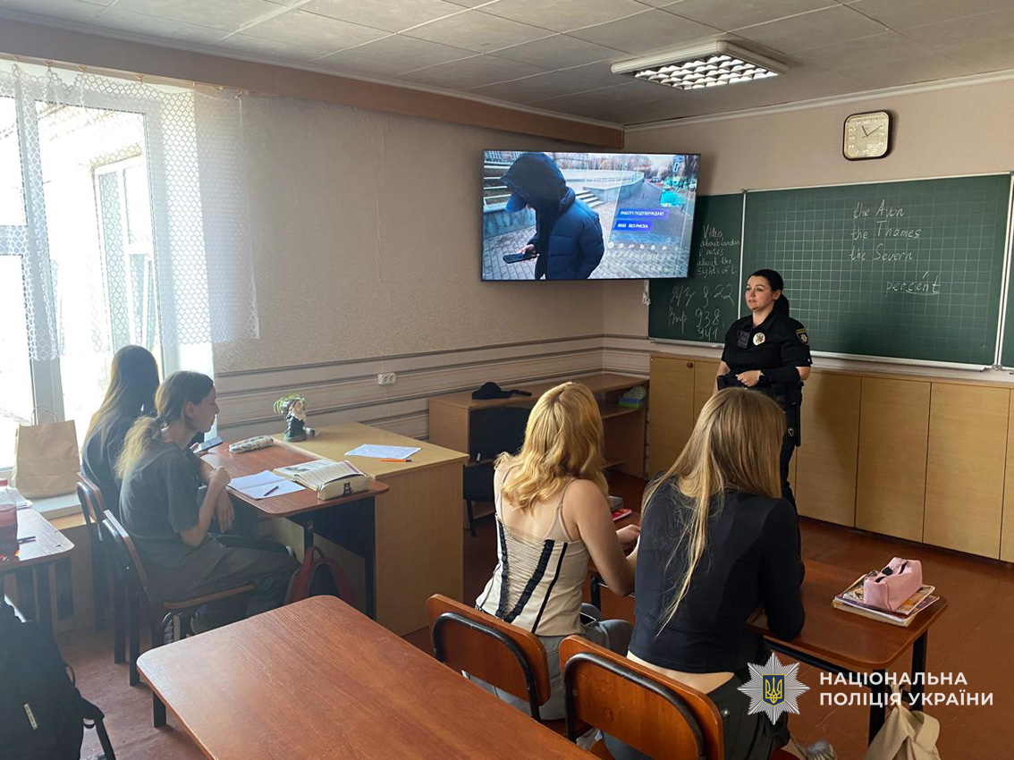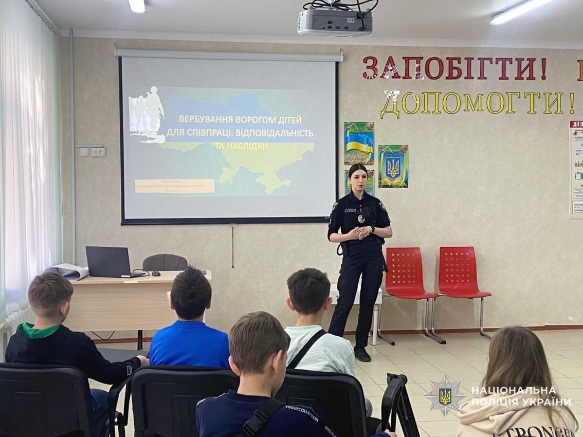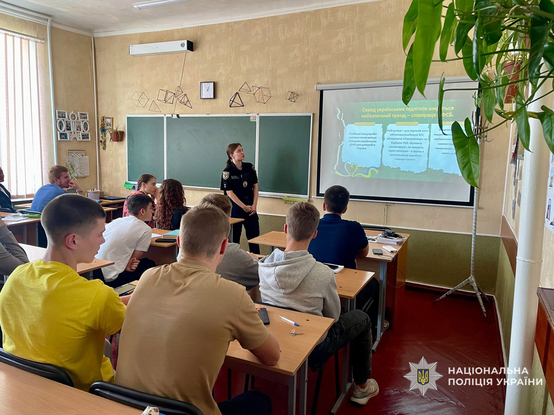Інспектори служби освітньої безпеки Ніжинського райуправління поліції проводять профілактичні зустрічі зі школярами, під час яких розповідають, як розпізнати спроби вербуванння з боку ворожих сил, куди звертатися у разі підозрілої поведінки співрозмовників у соцмережах, а також наголошують на відповідальності, передбаченій законодавством України за участь у підривній чи диверсійній діяльності.