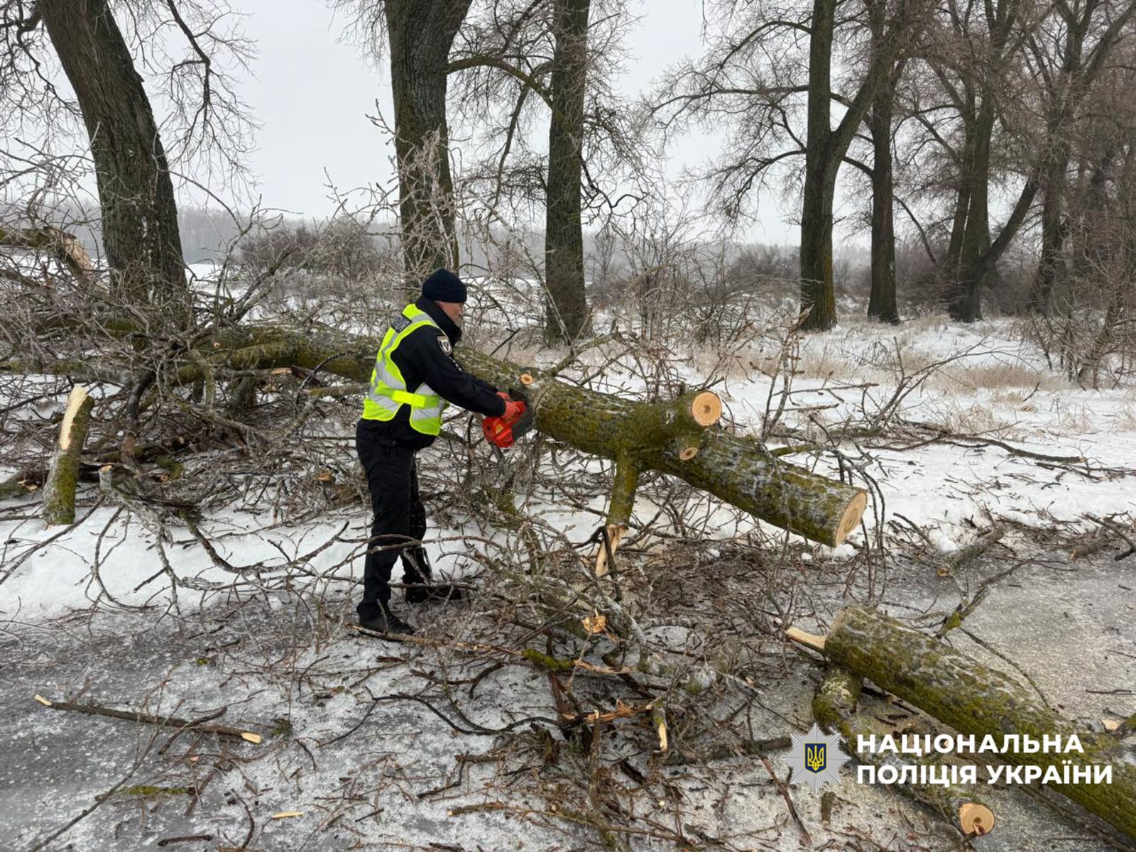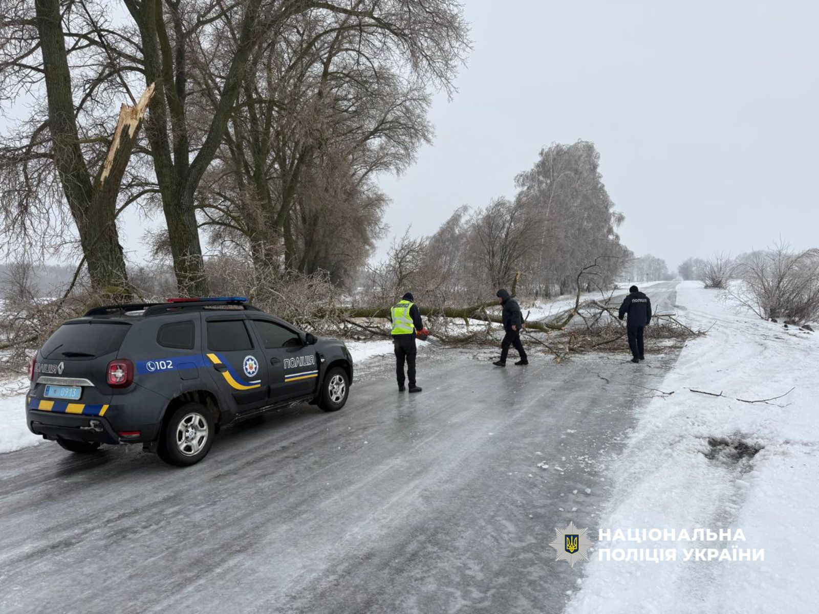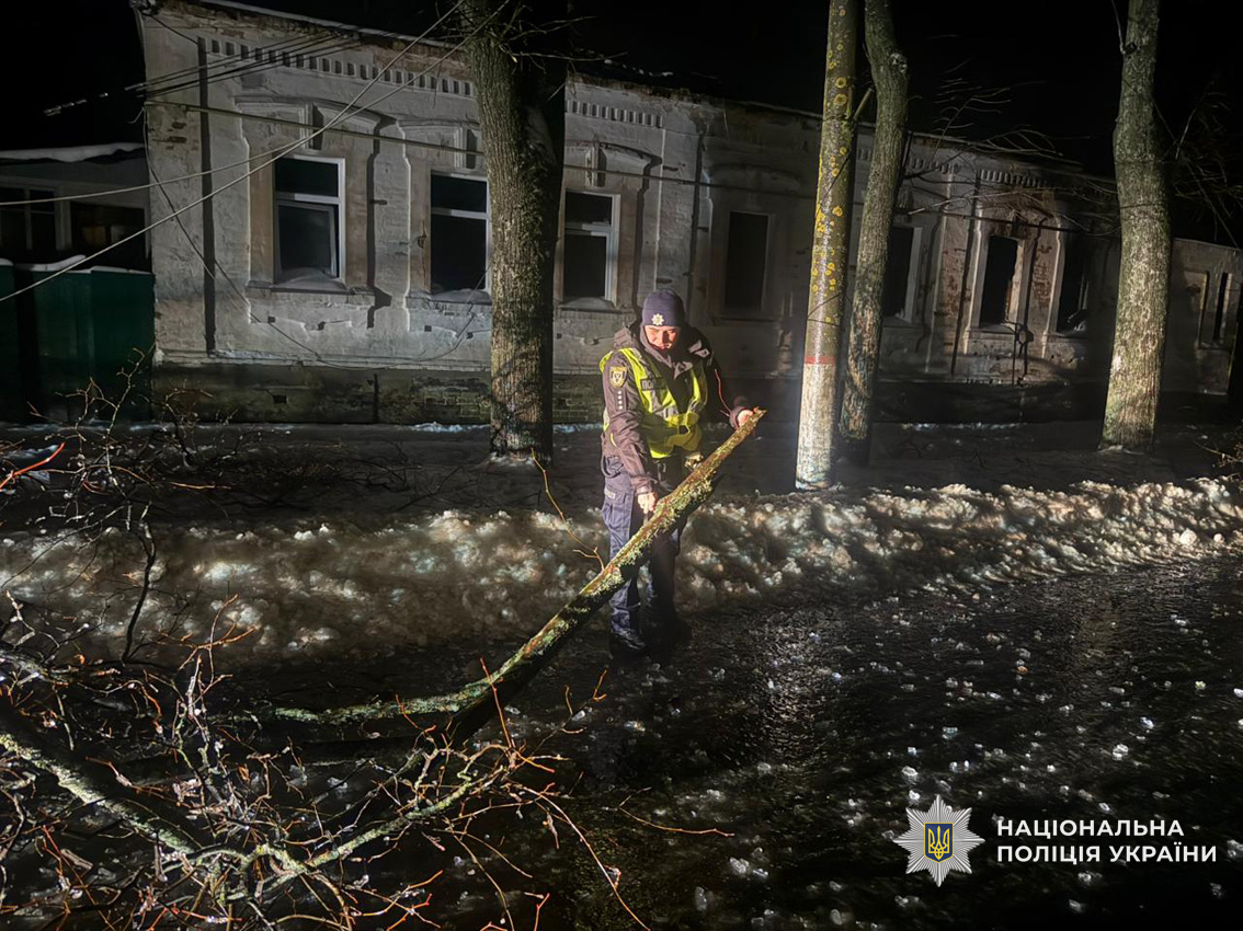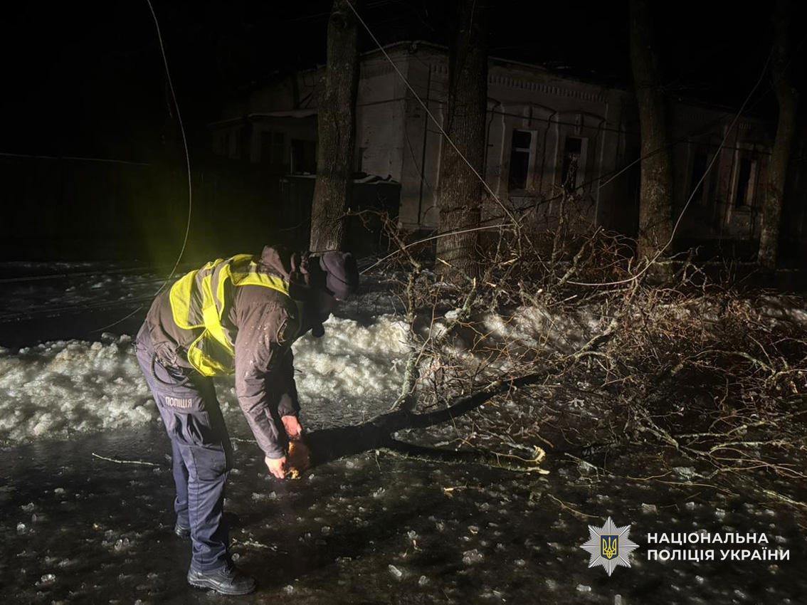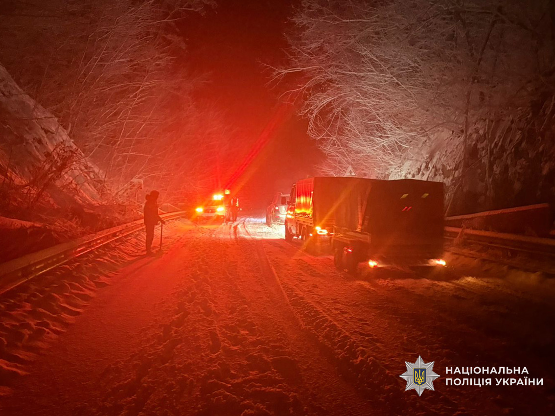 Внаслідок налипання мокрого снігу деякі автошляхи виявилися перекритими поваленими деревами. Поліцейські самотужки або спільно з працівниками комунальних служб негайно вживають заходів для відновлення вільного проїзду.