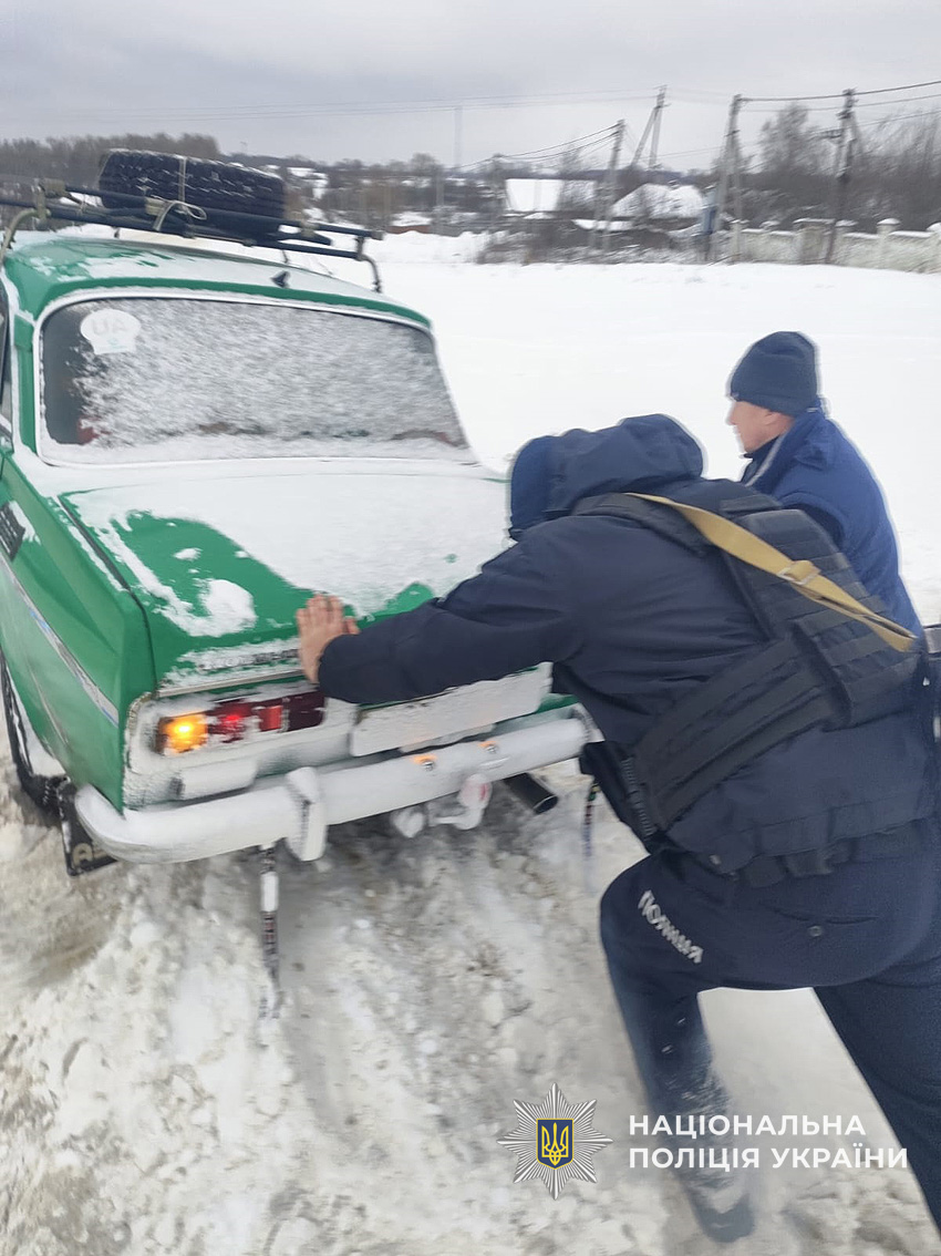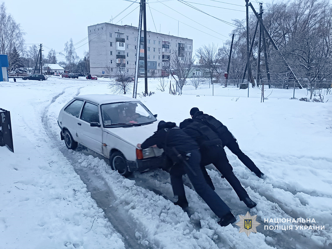 Екіпажі груп реагування патрульної поліції Чернігівщини, поліцейські офіцери громад, дільничні офіцери та поліцейські інших підрозділів у всіх районах області допомагають громадянам долати труднощі: звільняють автівки зі снігової пастки та допомагають безпечно виїхати зі складних ділянок доріг.