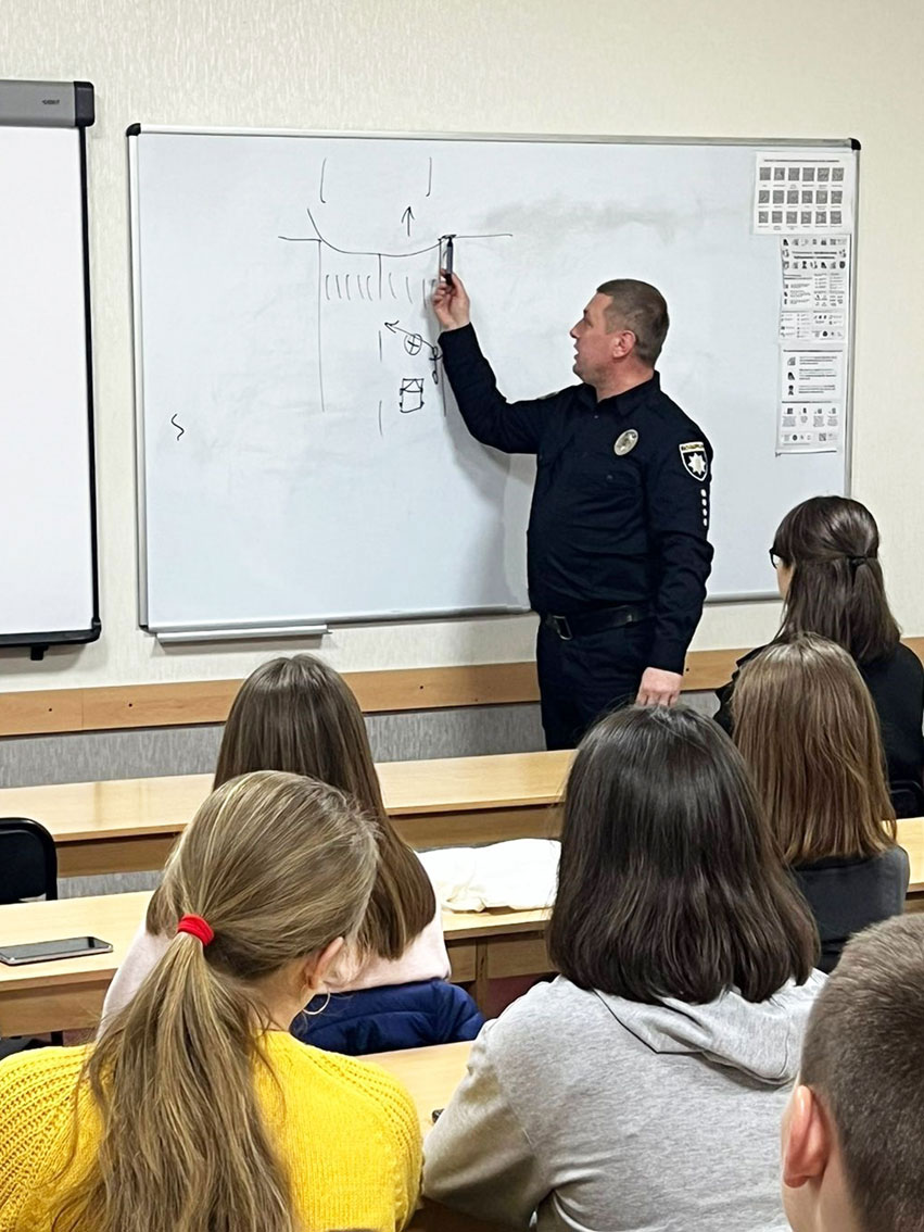 Під час зустрічі правоохоронці пояснили слухачам правила переходу вулиці, залежність дій пішохода від того, долає він регульований чи нерегульований перехід. Також офіцери нагадали, як правильно рухатися узбіччям, якщо нема тротуару.