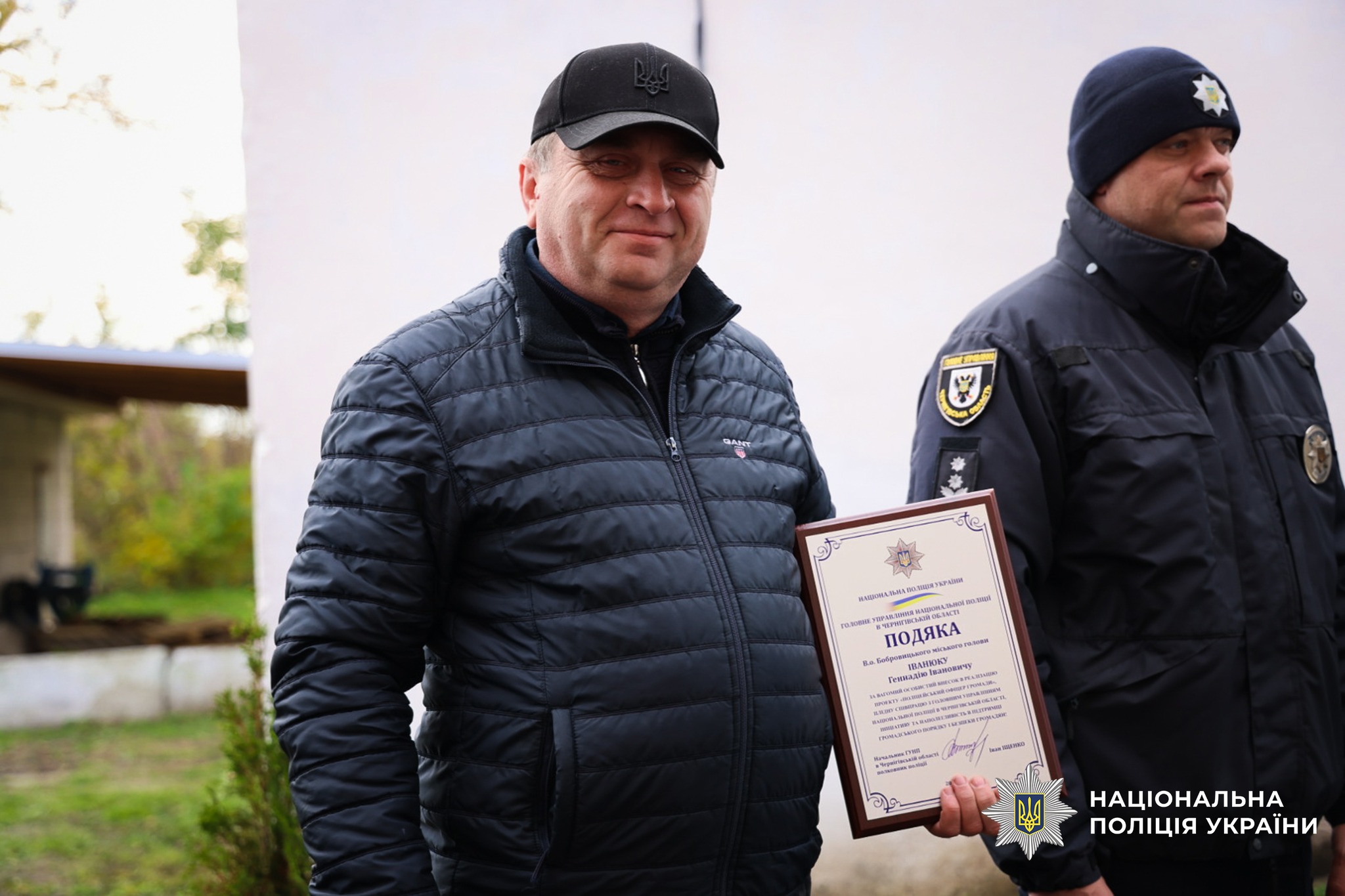 За плідну співпрацю з органами та підрозділами поліції Чернігівщини, вагомий особистий внесок в реалізацію проєкту «Поліцейський офіцер громади», ініціативу і наполегливість у питаннях підтримки правопорядку та безпеки громадян начальник обласної поліції вручив подяку виконуючому обов’язки Бобровицького міського голови Геннадію Іванюку, а також вручив нагрудний знак «За сприяння» керівнику місцевого агропідприємства Сергію Чубовському.