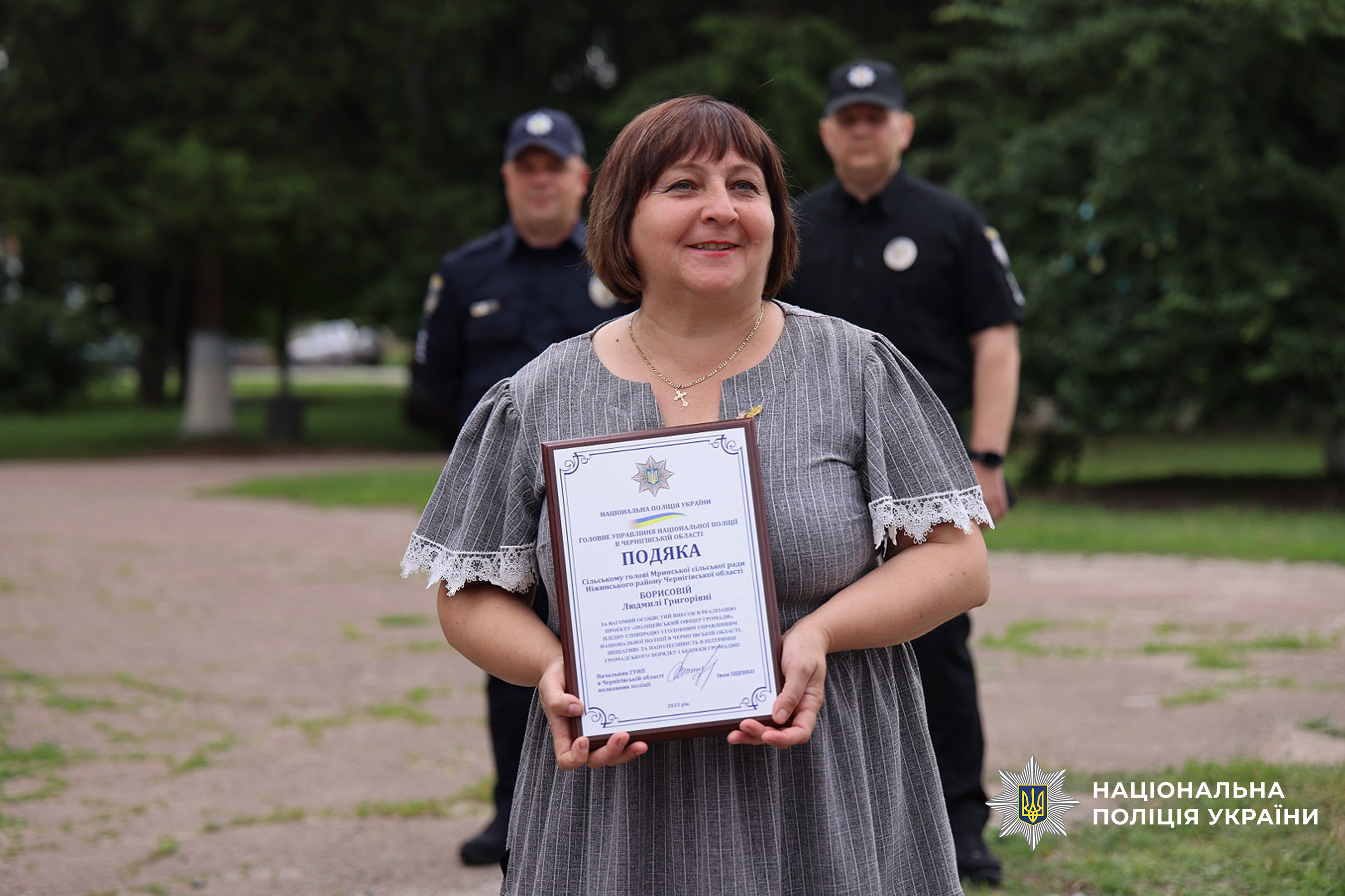 За плідну співпрацю з органами та підрозділами поліції Чернігівщини, вагомий особистий внесок в реалізацію проєкту «Поліцейський офіцер громади», ініціативу і наполегливість у питаннях підтримки правопорядку та безпеки громадян начальник обласної поліції вручив подяку сільському голові Мринської сільської ради Людмилі Борисовій.