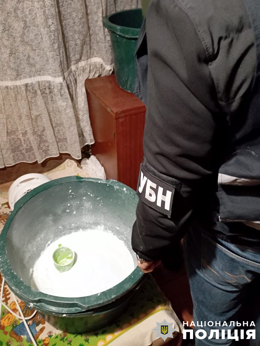 На дачі поблизу Чернігова поліцейські виявили та вилучили лабораторне обладнання (зворотній холодильник, електронні ваги, скляні колби різних форм, пластикові каністри з хімічними рідинами, які використовуються для синтезу психоактивних речовин, пакувальні матеріали), а також амфетамін вагою 1 кг 145 г.