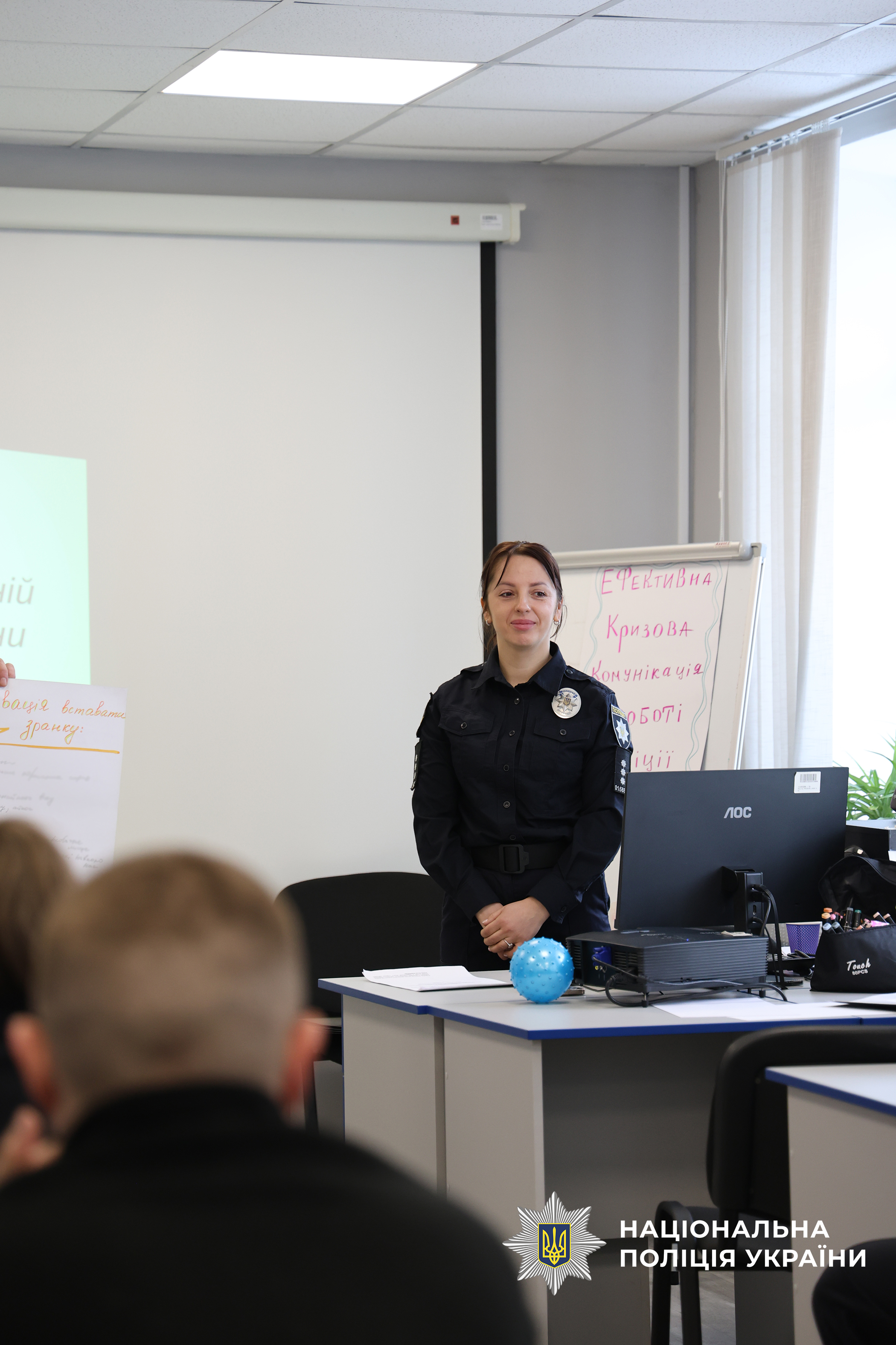 Під час практичних занять поліцейські опановують техніки уникнення конфліктів, методи активного слухання та способи вербальної підтримки громадян. Окремий блок присвячено збереженню довіри населення через професійну, коректну й людяну комунікацію навіть у найскладніших обставинах — що особливо важливо для прикордонного регіону, який систематично зазнає ворожих атак.