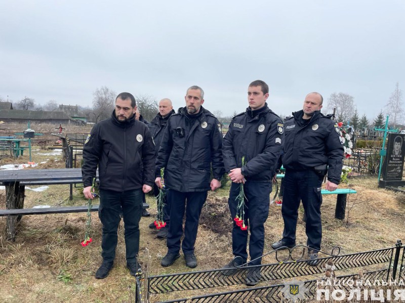 Начальник управління кадрового забезпечення поліції Чернігівщини Віталій Сандул разом з колегами та рідними Олега вшанували пам'ять полеглого захисника у його рідному селищі Холми Корюківського району.