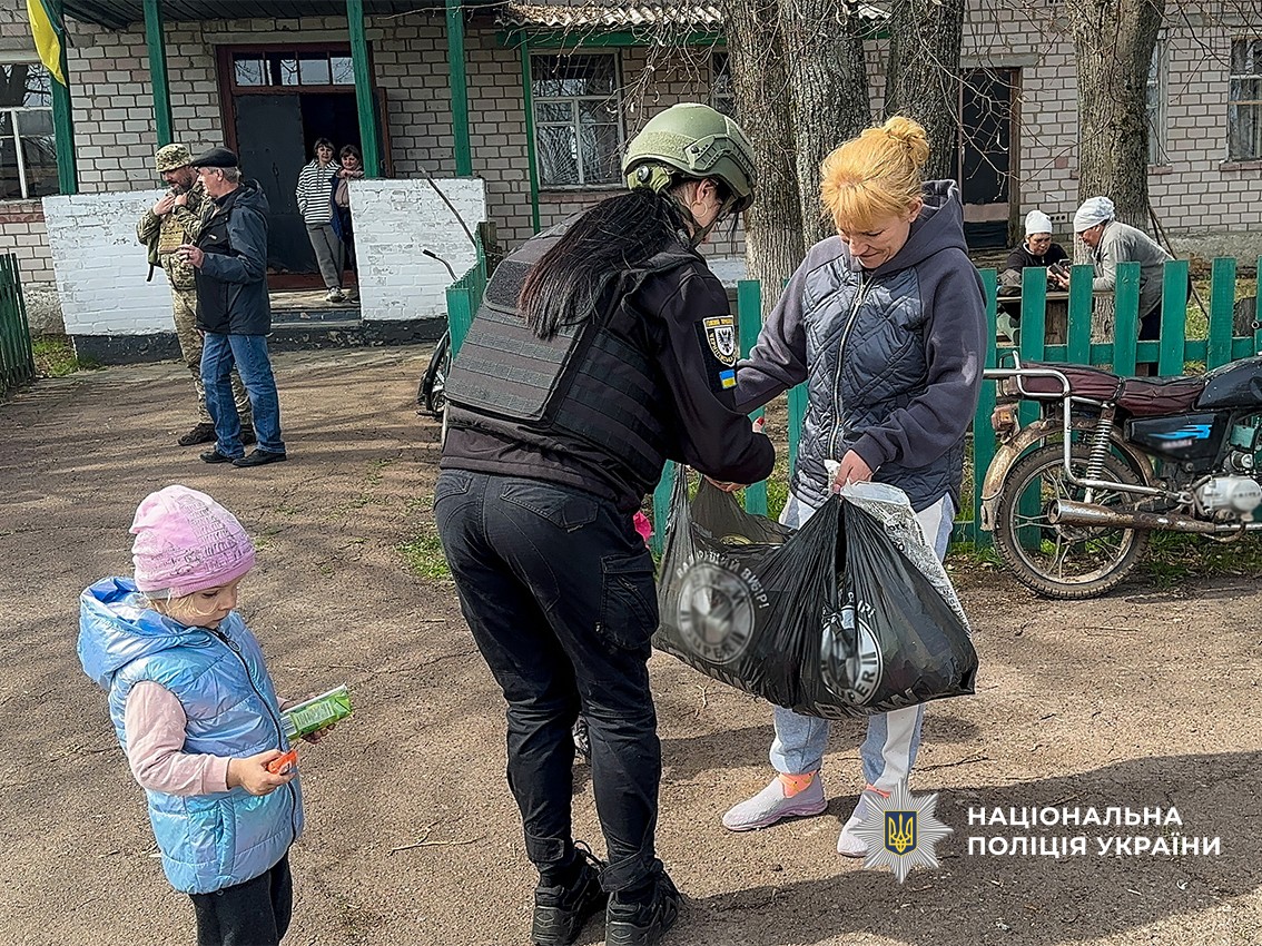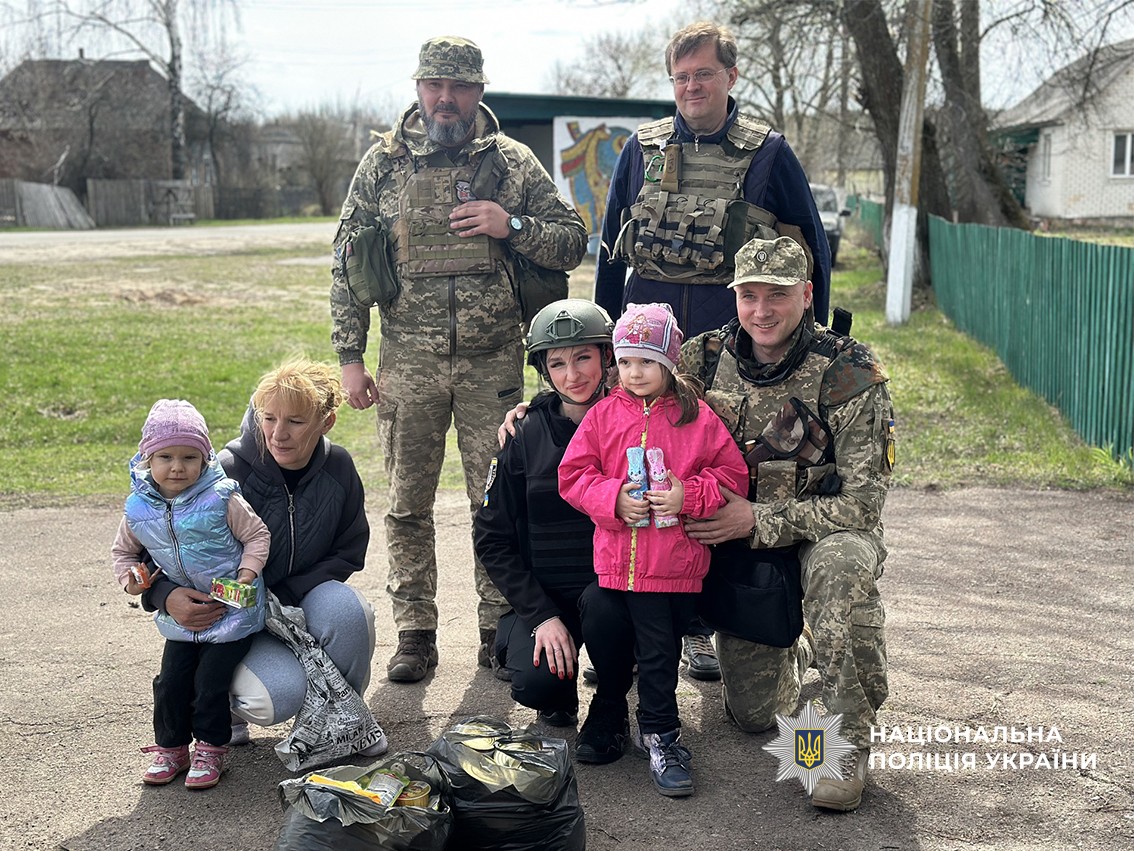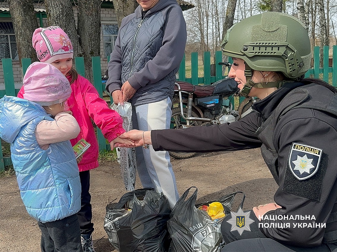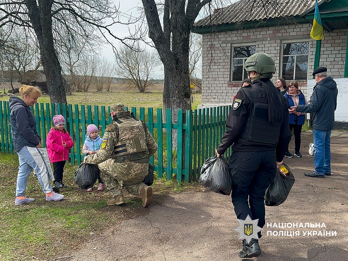 Напередодні Великодня ювенальні поліцейські Новгород-Сіверського районного відділу поліції спільно з військовослужбовцями оперативного командування «Північ» вчергове відвідали низку населених пунктів поблизу кордону з країною-агресором та надали підтримку родинам, які залишаються мешкати у зоні підвищеного ризику.