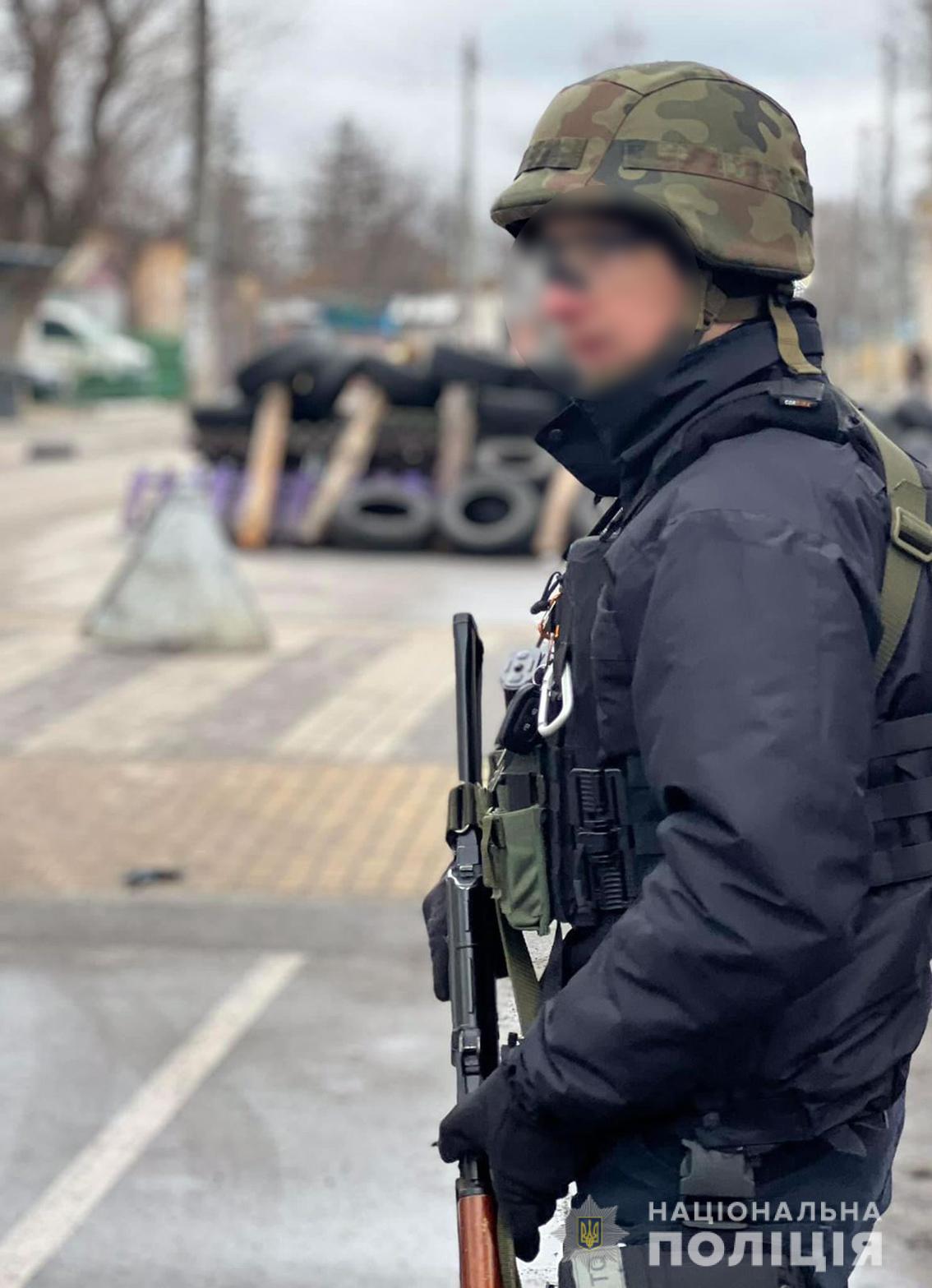 Поліцейські спільно з працівниками інших правоохоронних відомств, представниками територіальної оборони та громадських формувань охороняють блокпости та посилено патрулюють вулиці Чернігова та населених пунктів області.