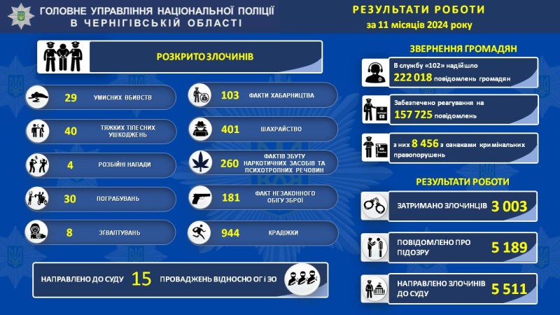 Поліція представила детальну інфографіку, що демонструє криміногенну ситуацію в Чернігівській області та розкриття поліцейськими різних видів злочинів.