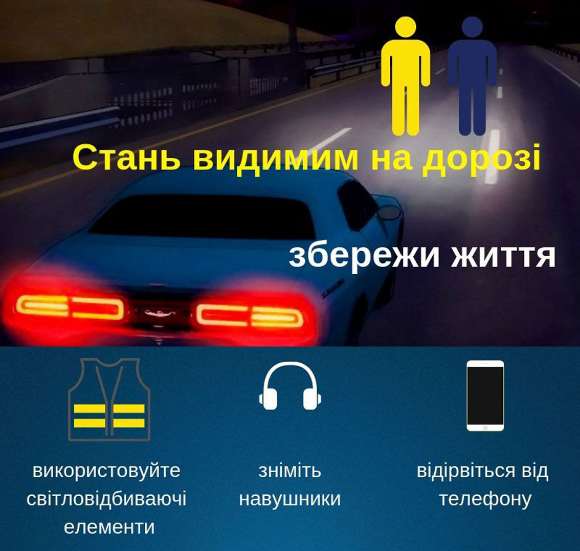 Відповідно до п. 4.4 ПДР України, у темну пору доби та в умовах недостатньої видимості пішоходи, які рухаються проїжджою частиною чи узбіччям, повинні використовувати світлоповертальні елементи (стрічку, наклейку, жилет тощо) або бути в одязі, який має світлоповертальні елементи.