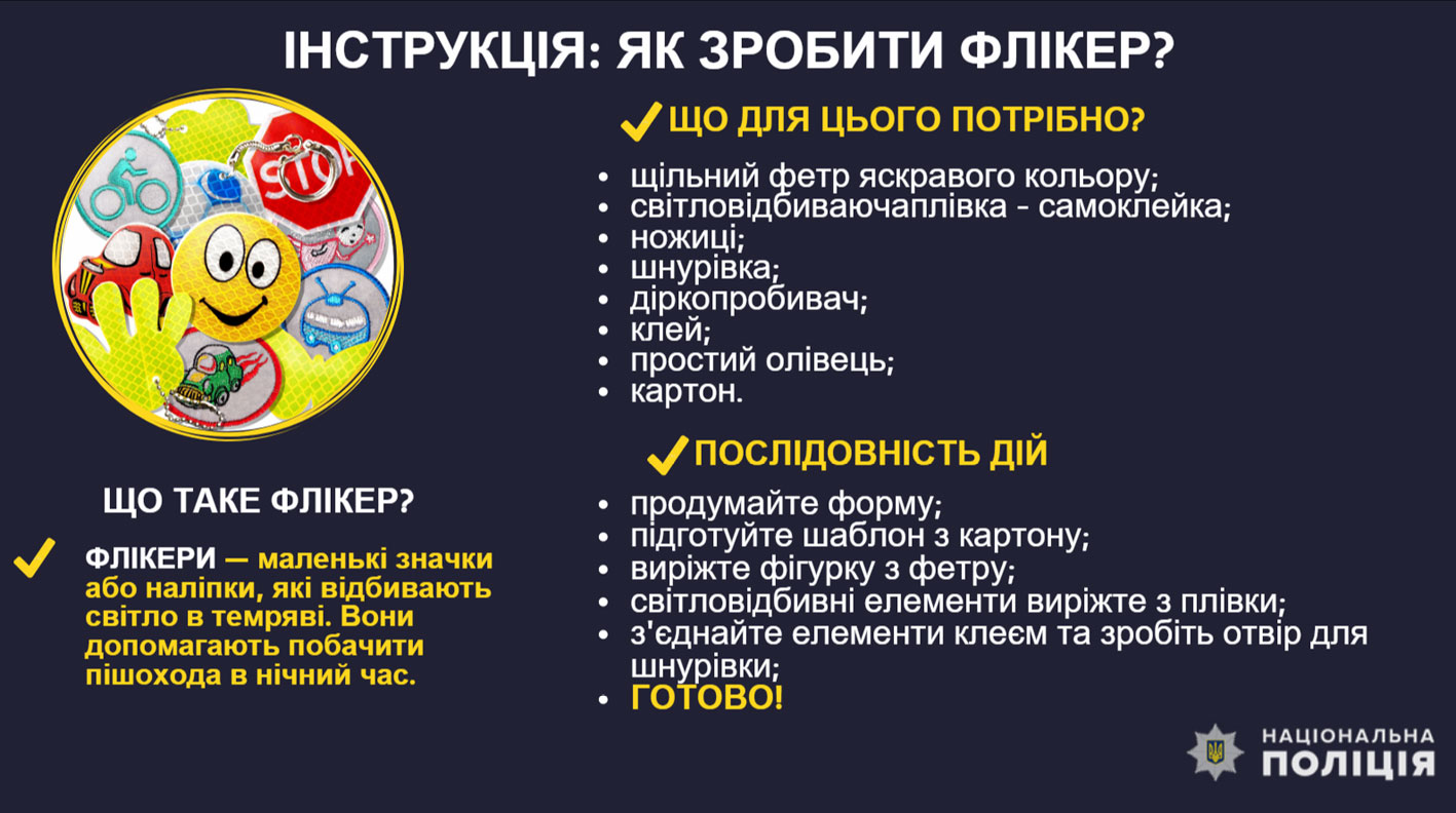 Наїзд на пішохода - один з найпоширеніших видів ДТП, причому найчастіше відбувається це в темний час доби. З настанням осені темніти починає раніше, до того ж нині в Чернігові не працює вуличне освітлення. Щоб вберегти себе на дорозі, поліція закликає пішоходів носити світлоповертаючі елементи на одязі та інших верхніх аксесуарах - шапках, сумках, рюкзаках.