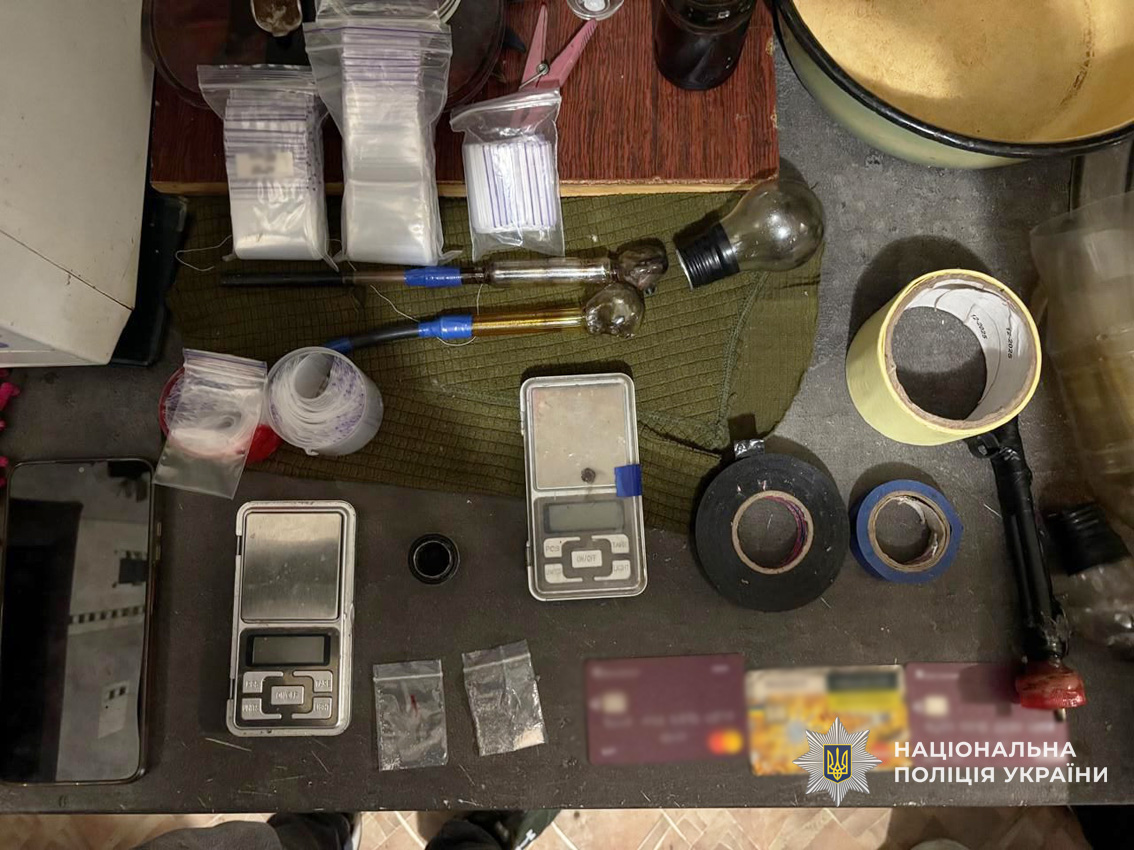 За силової підтримки бійців КОРД та кінолога поліції зі службовим собакою поліцейські провели низку санкціонованих обшуків у фігурантів, в ході яких виявили та вилучили півкілограми психотропної речовини солі Alfa-PVP, розфасовану в зіп-пакети, лабораторне обладнання, пластикові каністри з хімічними рідинами, які використовуються для синтезу психотропних речовин, респіраторні маски, захисні окуляри, засоби для фасування наркотиків, електронні ваги.
