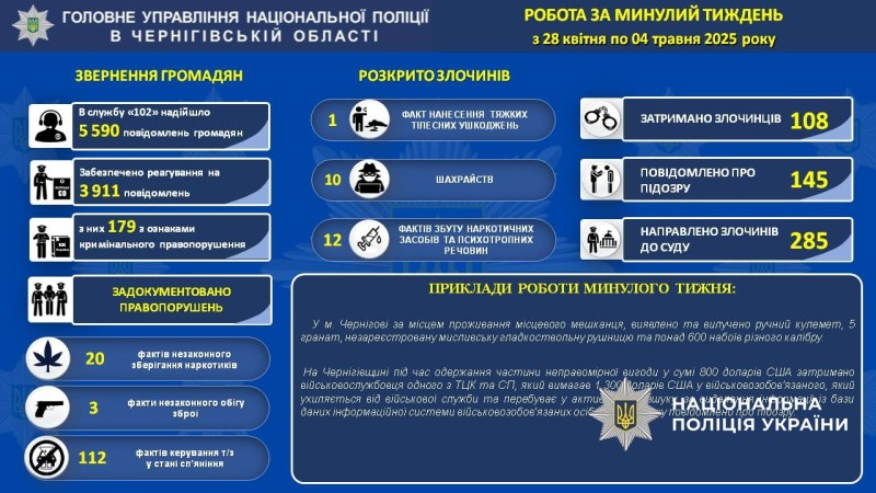 Поліція Чернігівської області представила щотижневий звіт про свою роботу