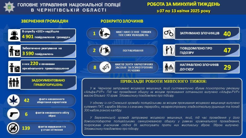 Поліція Чернігівської області представила щотижневий звіт про свою роботу