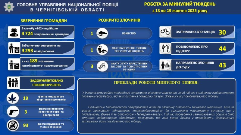 Поліція Чернігівської області представила щотижневий звіт про свою роботу