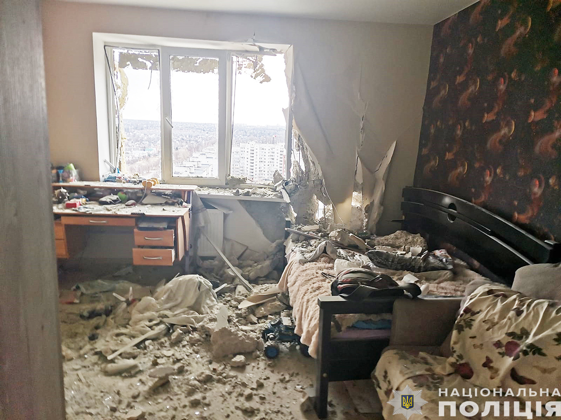 Під час одного з потужних ворожих обстрілів серйозних ушкоджень зазнала квартира поліцейського, який мешкає з родиною у багатоповерхівці в мікрорайоні «ЗАЗ». Було зруйновано зовнішню монолітну стіну завтовшки 40 см, вибухом «винесло» вікна в квартирі.