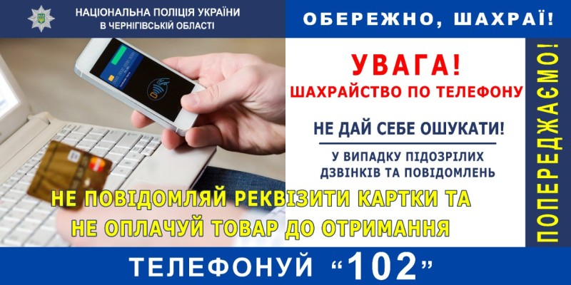 Поліцейські закликають мешканців Чернігівщини не передавати стороннім особам жодних відомостей про свої банківські картки. Представляючись співробітниками банків, шахраї випитують секретні дані і можуть отримати доступ до ваших рахунків.
