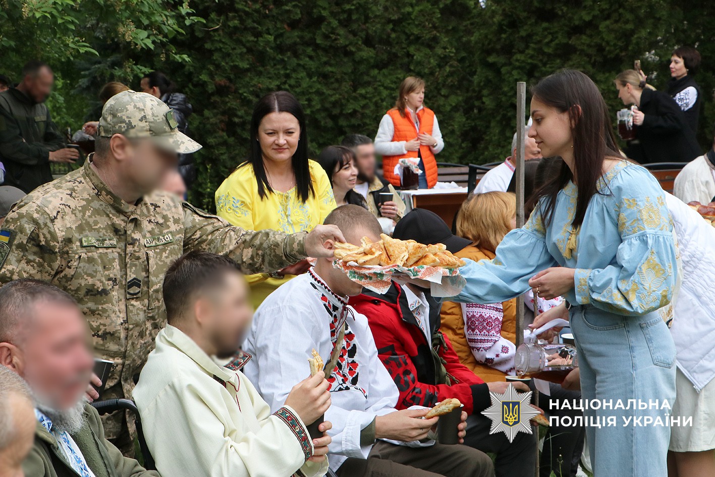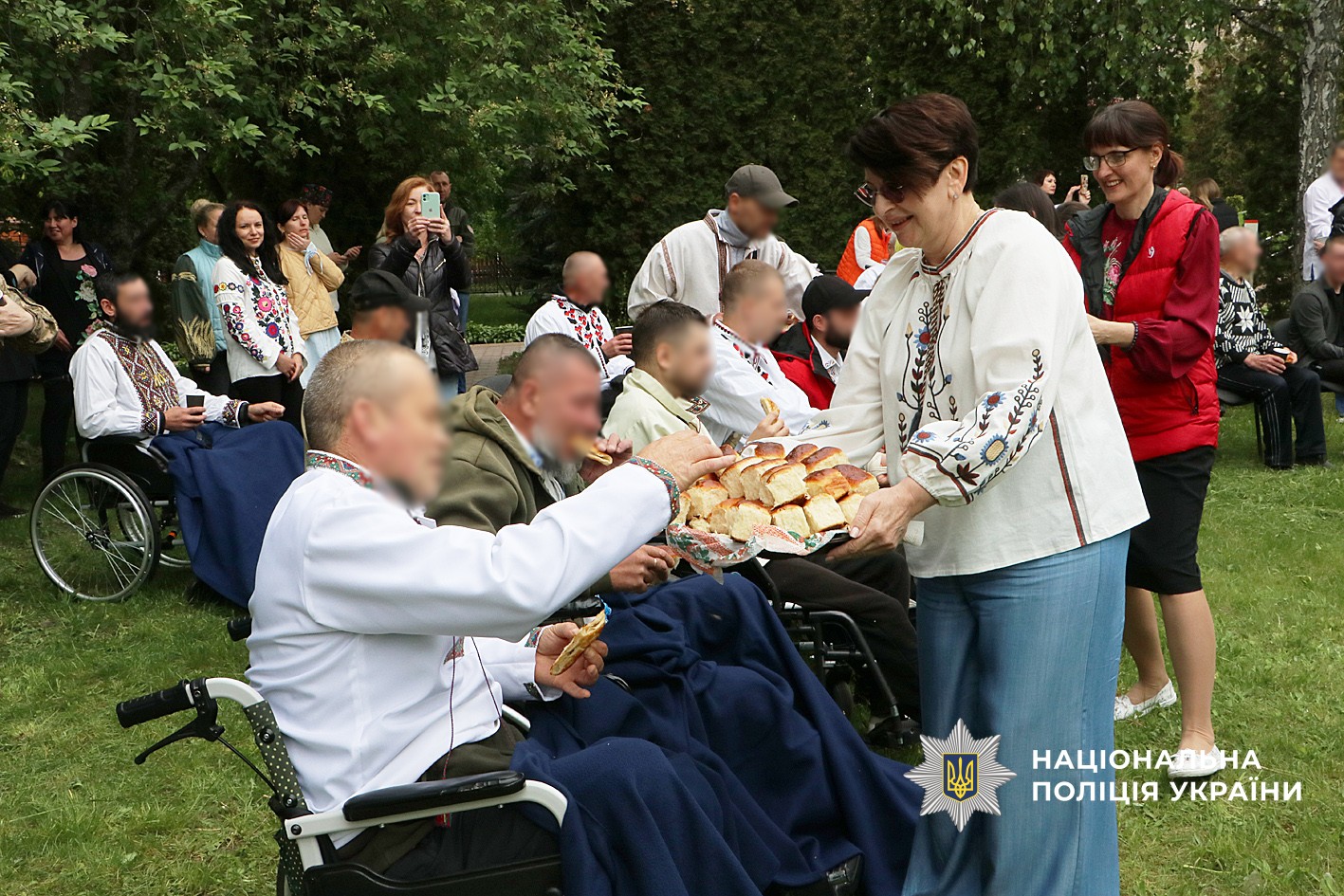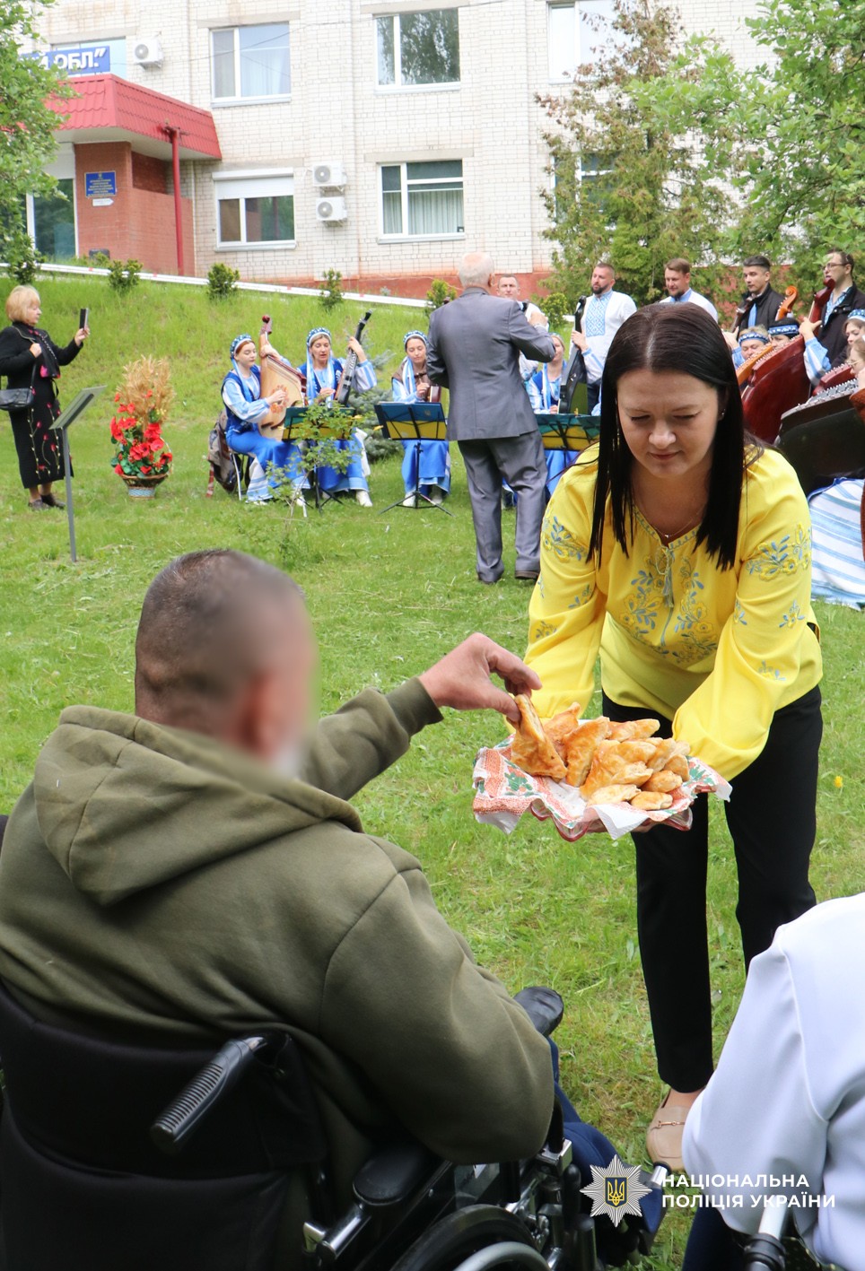 Для всіх присутніх учасників свята запрошена капела бандуристів ім. Остапа Вересая Чернігівського обласного філармонійного центру майстерно виконала низку українських пісень. Після цього медики почастували поранених поліцейських та нацгвардійців власноруч виготовленими смаколиками – ясна річ, зразками виключно національної української кухні.
