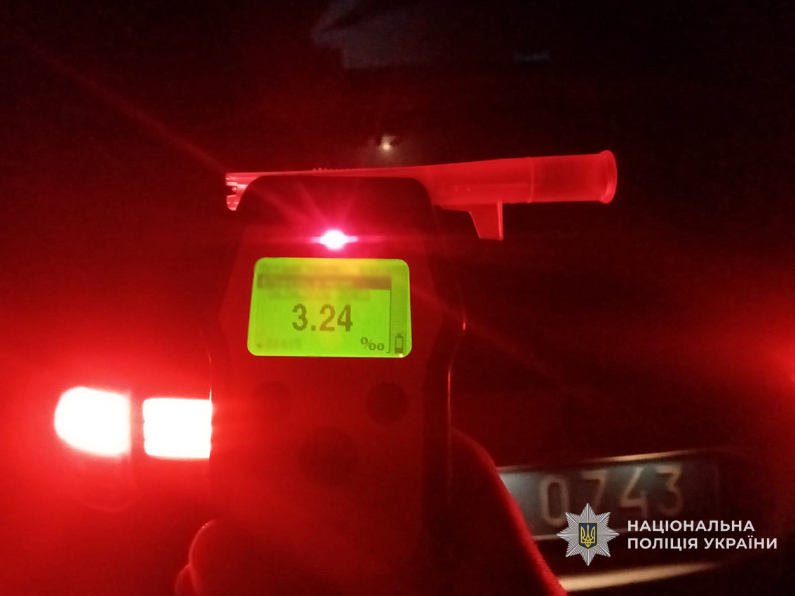 Під час спілкування з 39-річним водієм поліцейські помітили у нього ознаки алкогольного сп’яніння та запропонували пройти тест на визначення рівня алкоголю за допомогою приладу «Drager». Результат – 3,24 проміле, що більш ніж у 16 разів вище за норму.