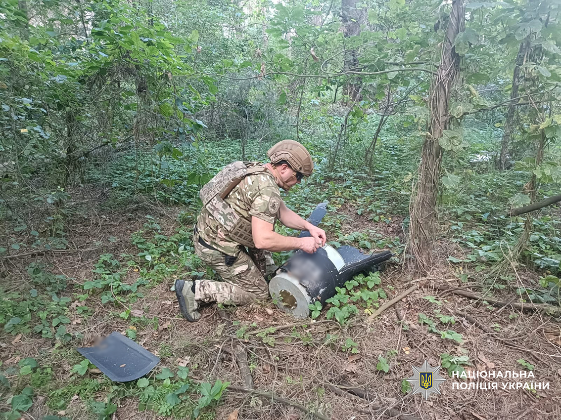 Днями до поліції надійшла інформація, що у лісовому масиві в Чернігівському районі виявлено уламки збитого ворожого ударного БПЛА. Його бойова частина не здетонувала, тож фахівці вибухотехнічної служби поліції у безпечний спосіб вилучили її, а потім транспортували на спеціально визначений майданчик для подальшого знищення.