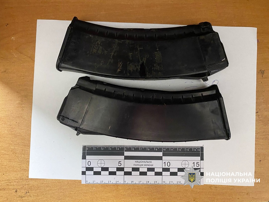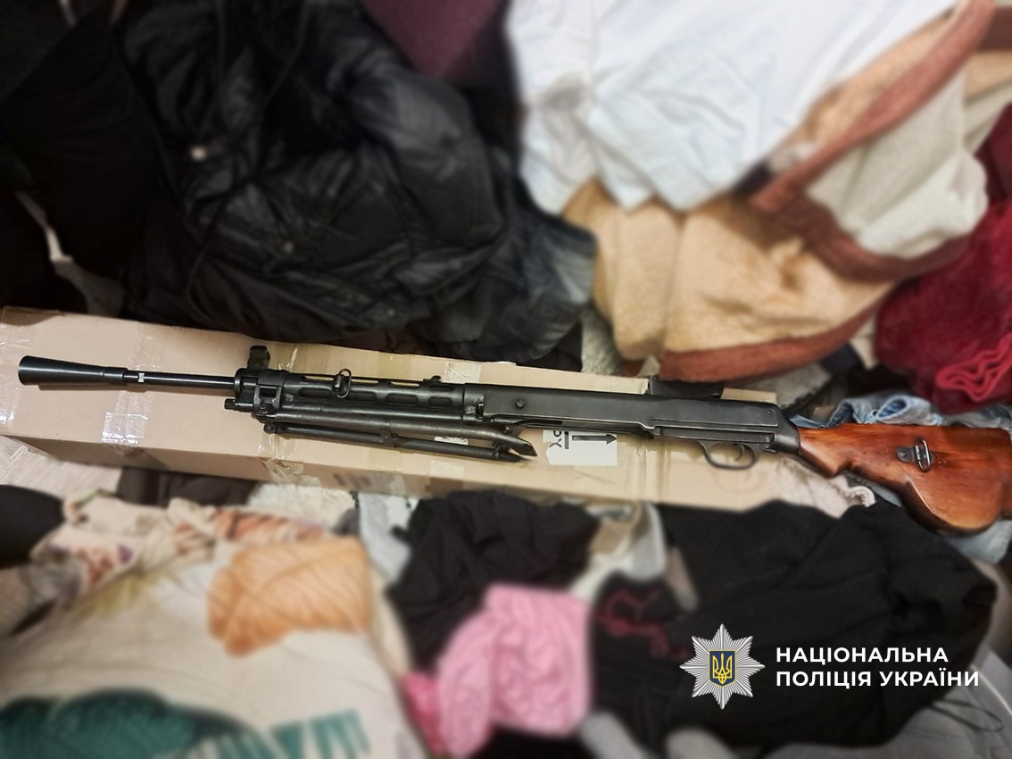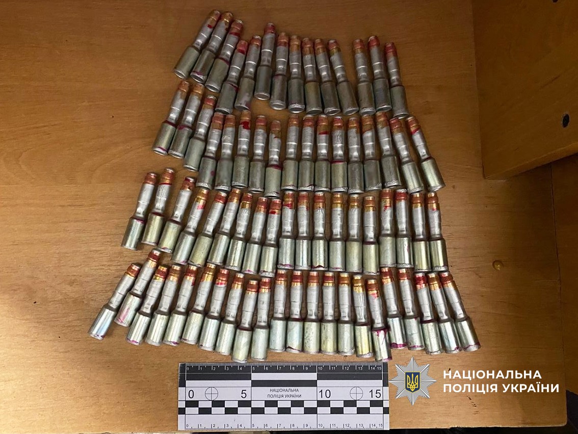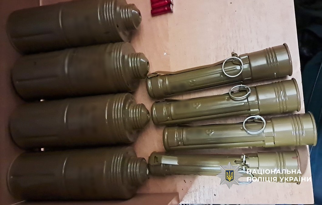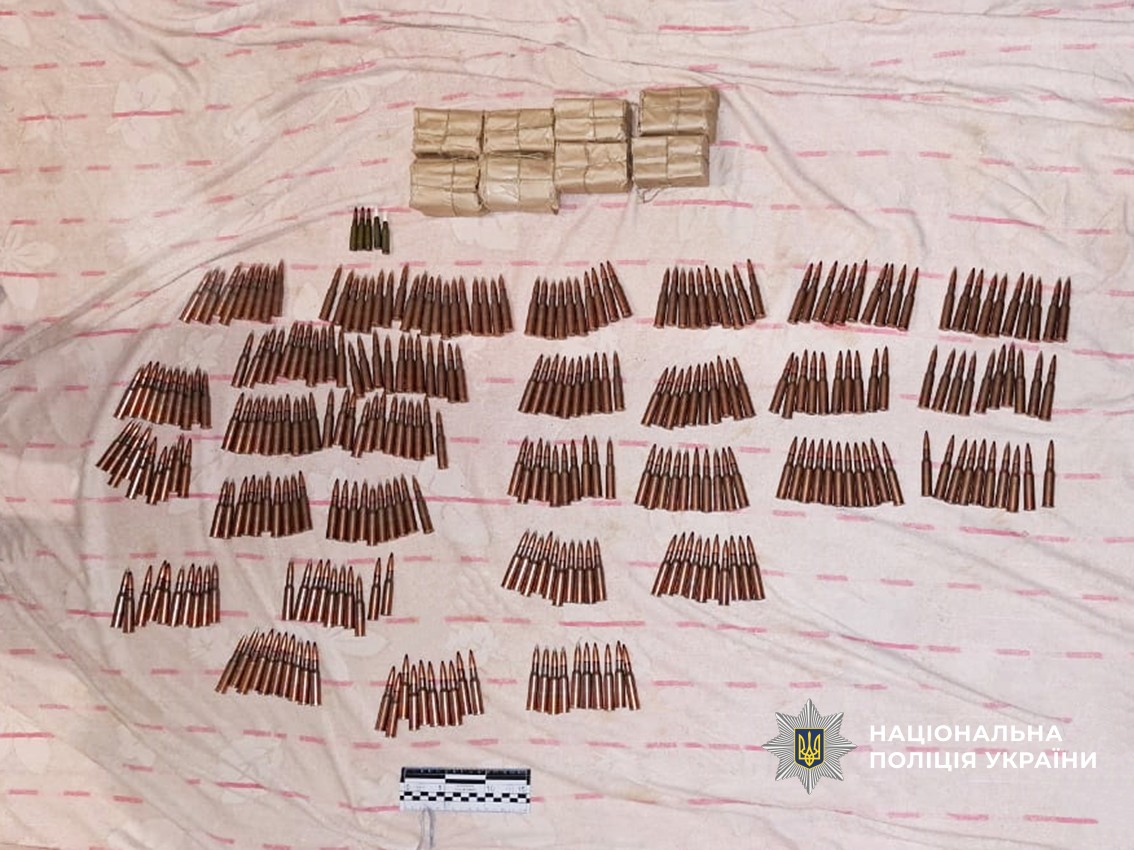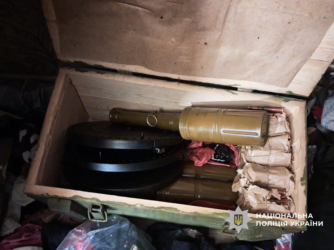 Під час невідкладних слідчих дій поліцейські виявили та вилучили: 4 ручні протитанкові гранати та запали до них, корпус гранати Ф-1, ручний кулемет та 3 магазини до нього, понад 600 набоїв до автоматичної стрілецької зброї калібрів 5,45 та 7,62 мм, мисливську гладкоствольну рушницю, а також 72 учбово-імітаційні запали.