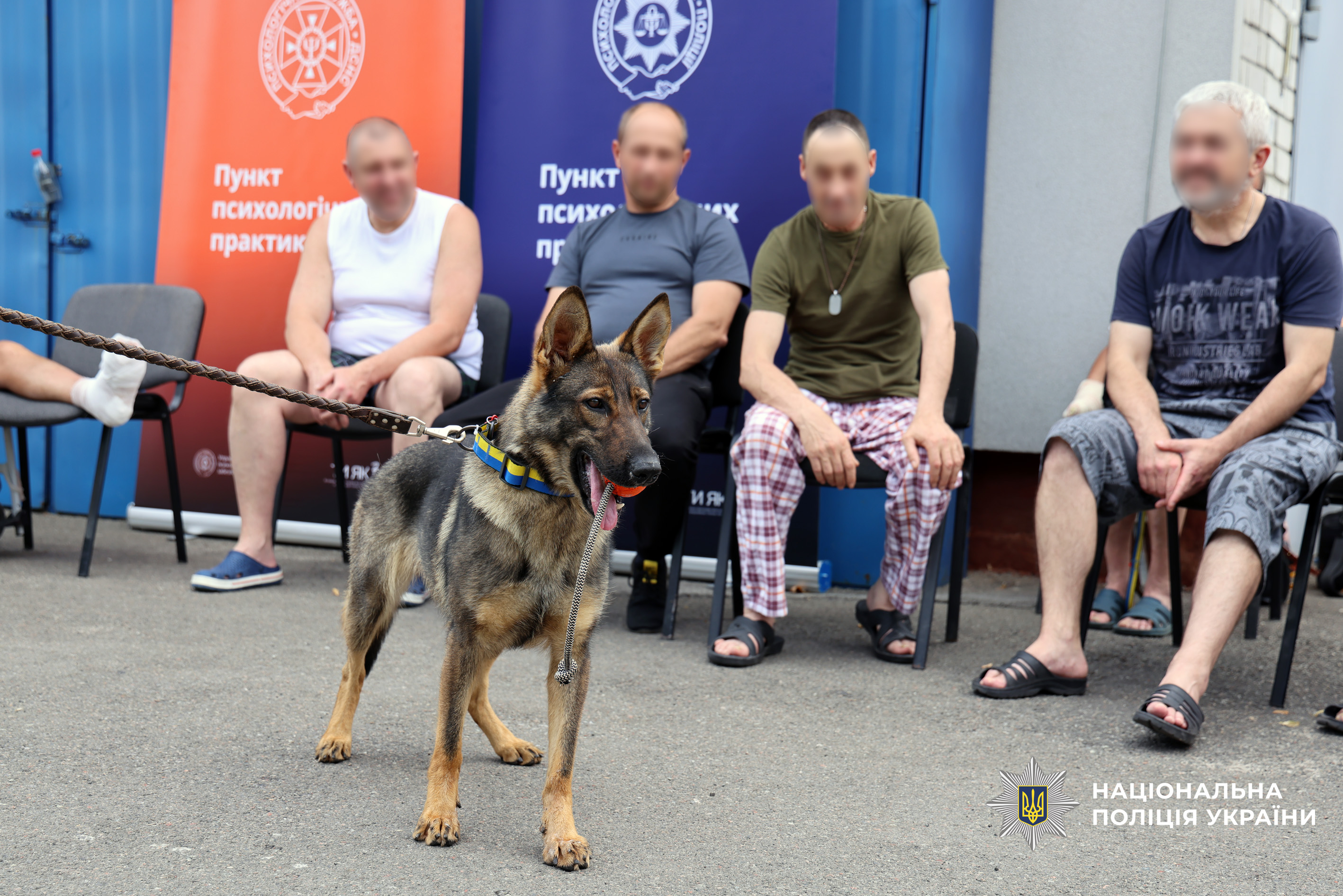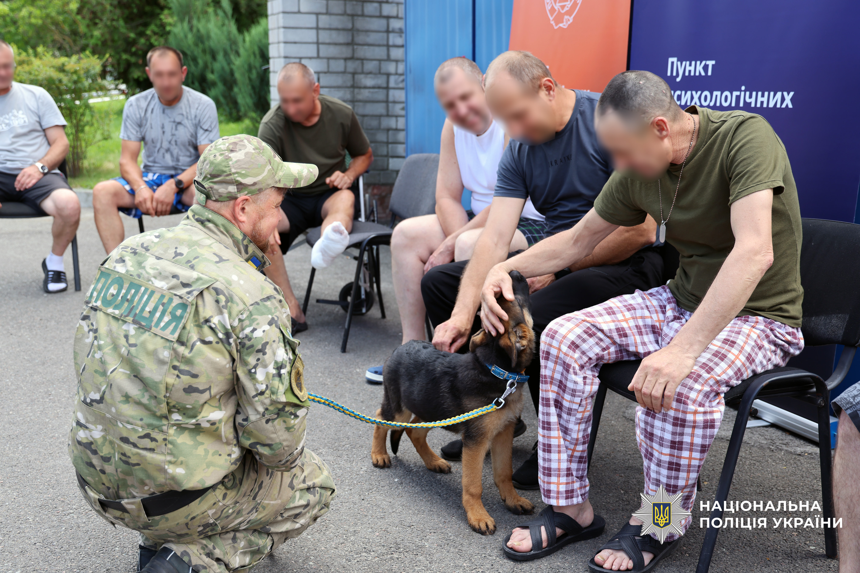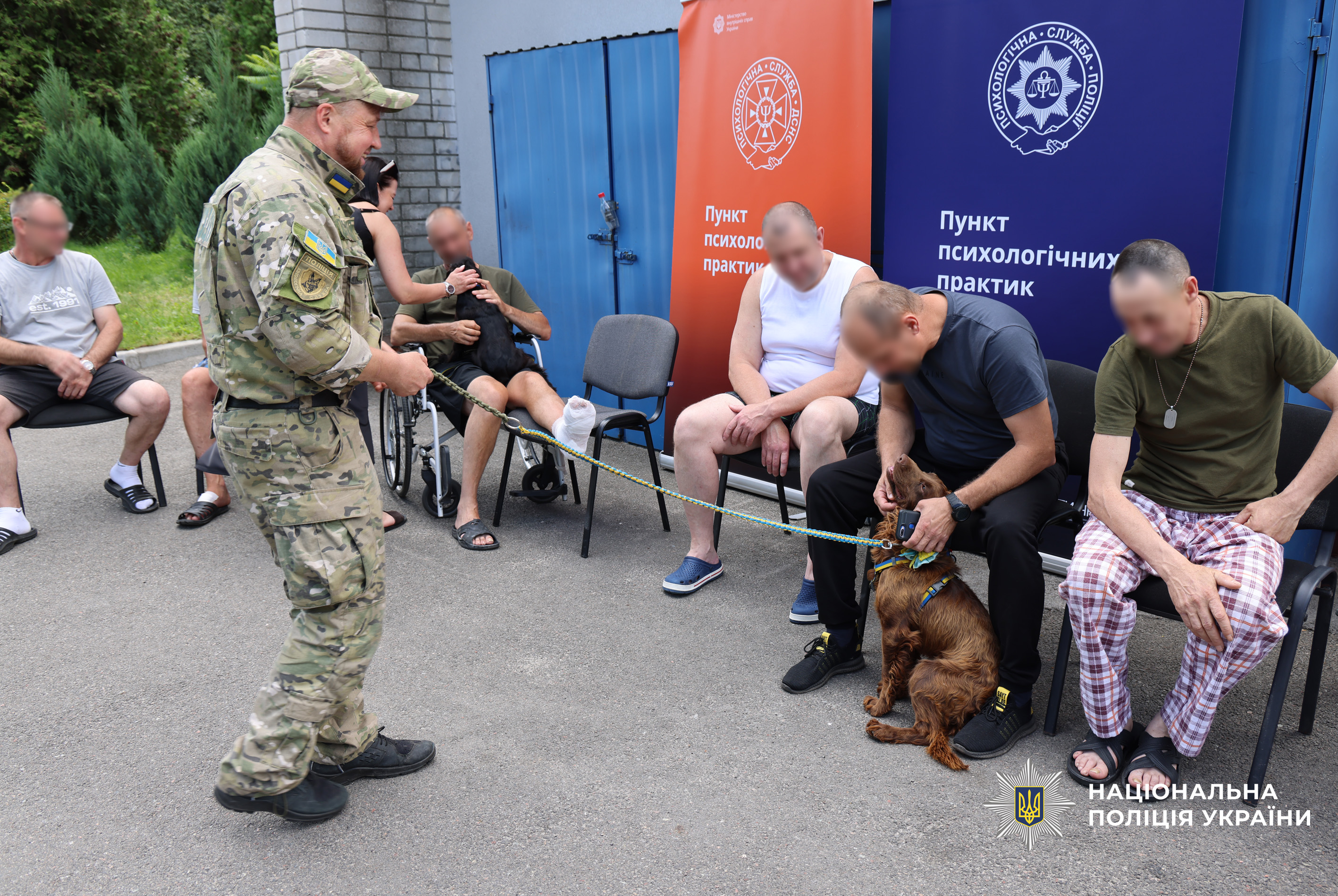 Поліцейські психологи спільно з колегами з сектору соціального захисту і супроводу постраждалих та членів їх сімей ДУ «ТМО МВС України по Чернігівській області» та психологами ДСНС організували для поранених захисників сеанс терапії з елементами каністерапії – методу психоемоційної підтримки, що базується на взаємодії людини з собакою. Психологи та кінологи продовжують співпрацю, що спрямована на ефективну реабілітацію наших бійців.