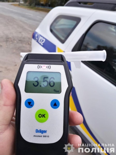 Під час спілкування з 38-річним водієм поліцейські виявили в нього ознаки сильного алкогольного сп’яніння. Чоловік погодився пройти на місці зупинки тест за допомогою приладу Drager. З’ясувалося, що рівень алкоголю в крові водія складає 3,56 проміле, або майже у 18 разів більше від гранично допустимого значення (0.2 проміле).