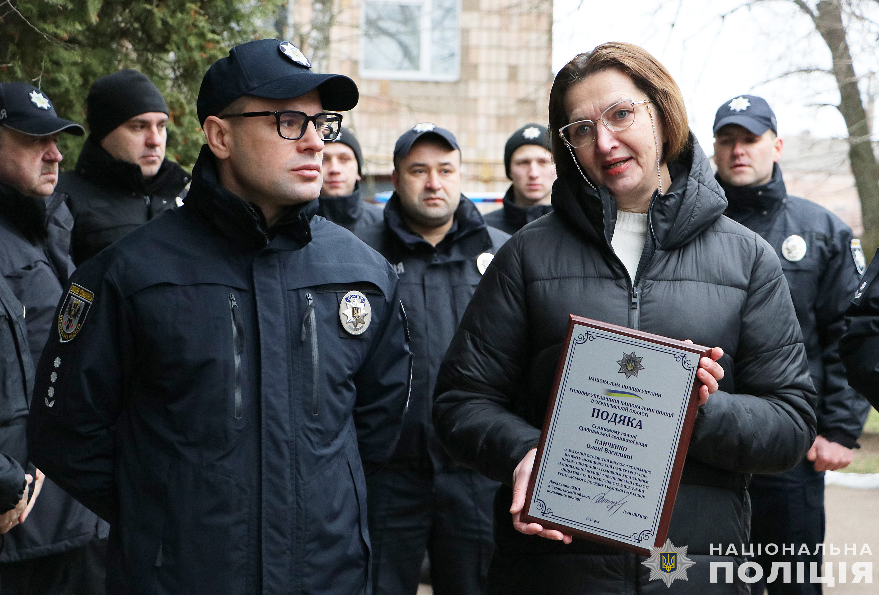 За плідну співпрацю з органами та підрозділами поліції Чернігівщини в рамках проєкту «Поліцейський офіцер громади» начальник обласної поліції вручив подяку селищному голові Срібного Олені Панченко.