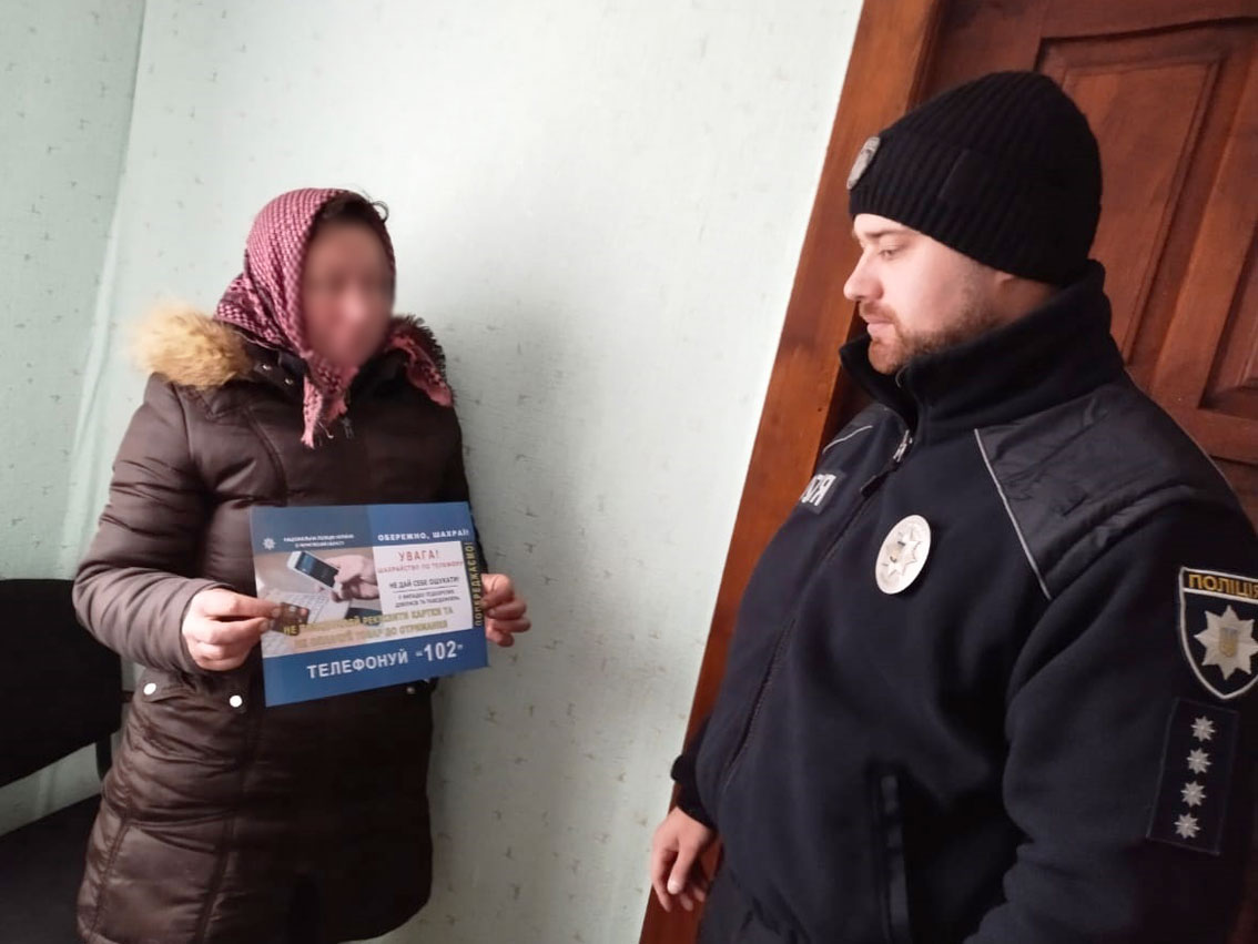 На Чернігівщині поліція проводить профілактичне відпрацювання для інформування громадян про шахрайські схеми. Поліцейські розповсюджують серед населення інформаційні листівки, аби убезпечити громадян від найпоширеніших видів шахрайства. Кожна така листівка містить опис найбільш «популярних» шахрайських прийомів, рекомендації поліції як діяти в тій чи іншій ситуації.