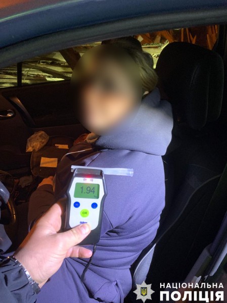 До поліції надійшло повідомлення від мешканців одного з сіл Киїнської громади, що невідомий автомобіль заїхав у складені біля обійстя заявників дрова. Прибувши на місце події, поліцейські встановили, що водійка автомобіля «Renault Scenic» не впоралася з керуванням та скоїла ДТП. Під час спілкування з 44-річною жінкою патрульні помітили у неї ознаки алкогольного сп'яніння. Огляд у визначеному законом порядку за допомогою приладу Drager засвідчив наявність у крові жінки 1,94 проміле алкоголю (або у майже 10 разів вище від допустимої межі – 0,2 проміле).