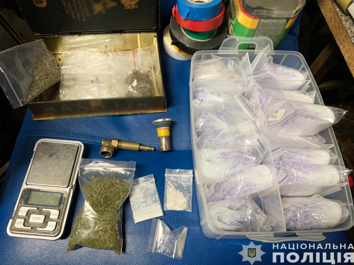 Поліцейські провели також санкціоновані обшук в оселях зловмисників, де виявили зіп-пакети з психотропною речовиною, зіп-пакети з канабісом, засоби для фасування, пристрої для паління та ваги.