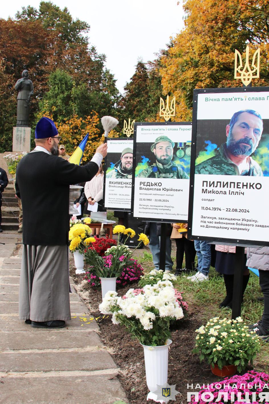Віддати шану полеглим Героям зібралися родичі загиблих захисників, поліцейські, військовослужбовці, представники місцевої влади та духовенства, а також місцеві мешканці. Люди прийшли з квітами, які поклали до стендів.