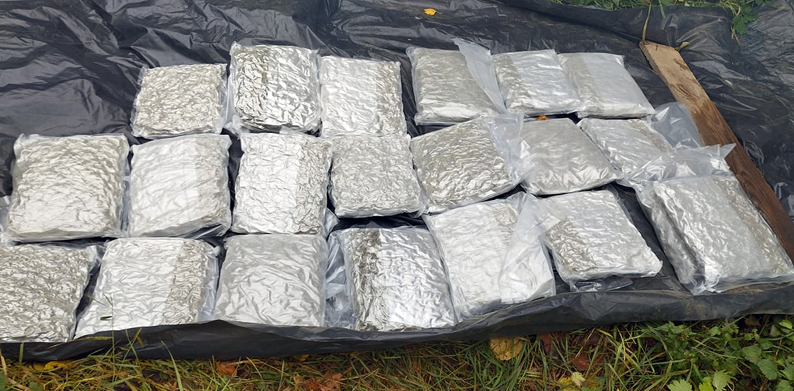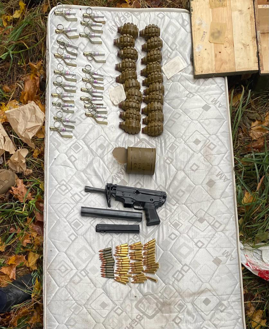 Під час обшуку у помешканні підозрюваного в одній з прикордонних громад Чернігівщини поліцейські виявили три сховки зі автоматами, кулеметом і гранатами та 14 кілограмів наркотиків. Сховки були закопані в землю у металевих діжках.